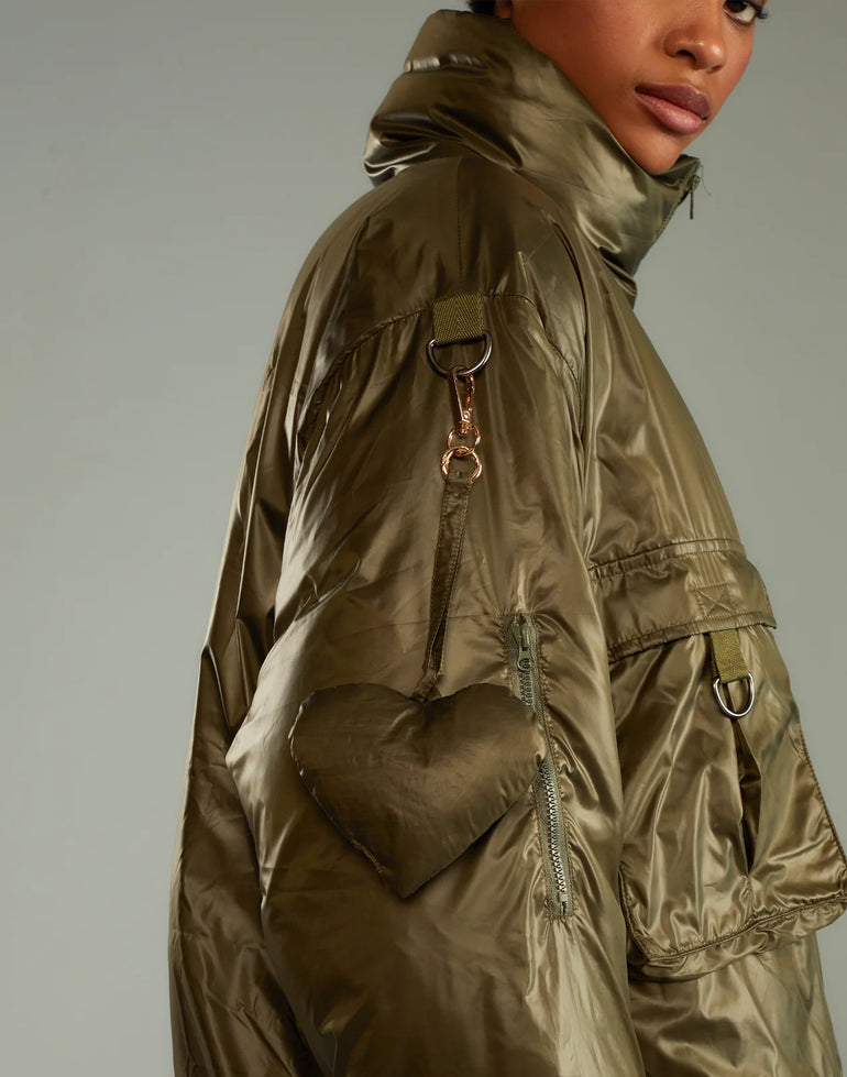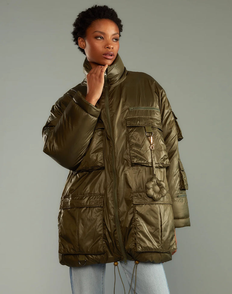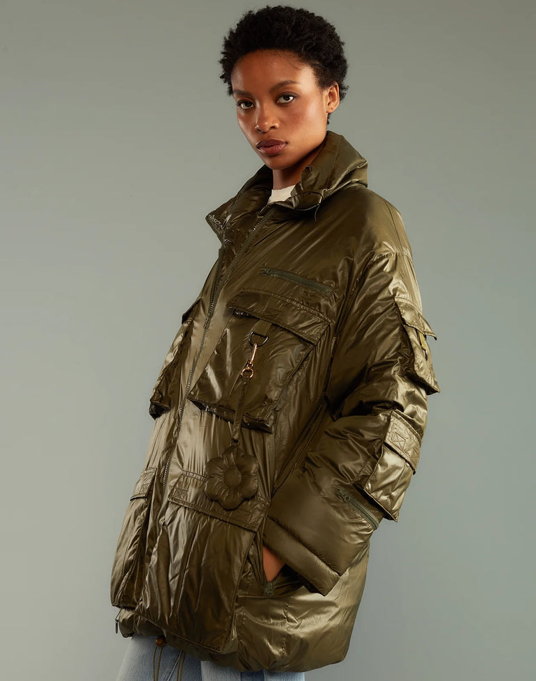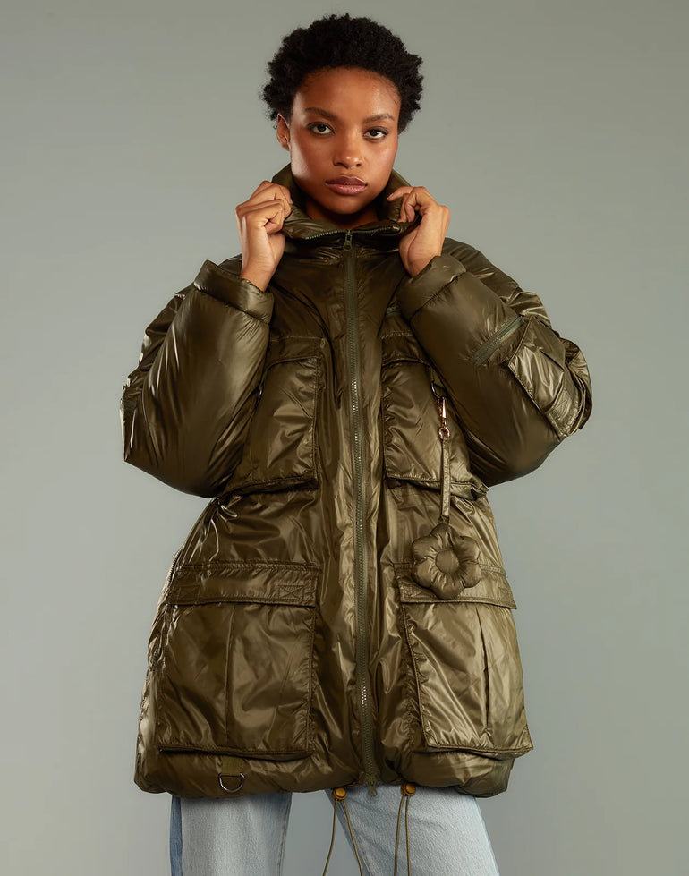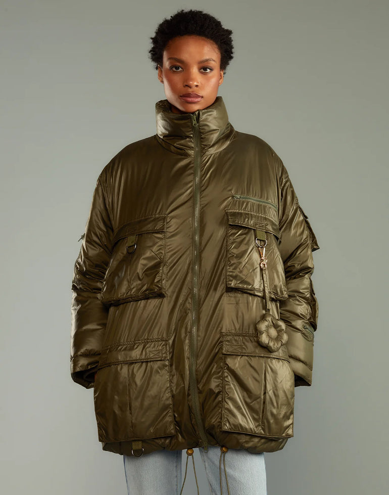Pockets, pockets, pockets, olive green oversized down puffer coat.