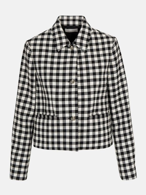 This stylish piece features a cropped silhouette and structured fit, making it a chic addition to any wardrobe. The bold check pattern and silver dome buttons bring a touch of sophistication and versatility, perfect for layering over casual or office outfits. The fabric is made in Turkey.