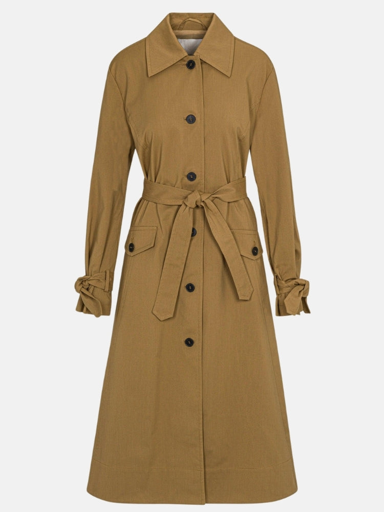 Crafted from premium sateen fabric, this trench coat combines classic elegance with modern sophistication. It features a belted waist for a flattering silhouette, button-down closure, and stylish flap pockets. The adjustable cuffs add a touch of versatility, allowing you to tailor the fit to your preference. Perfect for transitioning seasons, this trench coat is a timeless addition to any wardrobe.