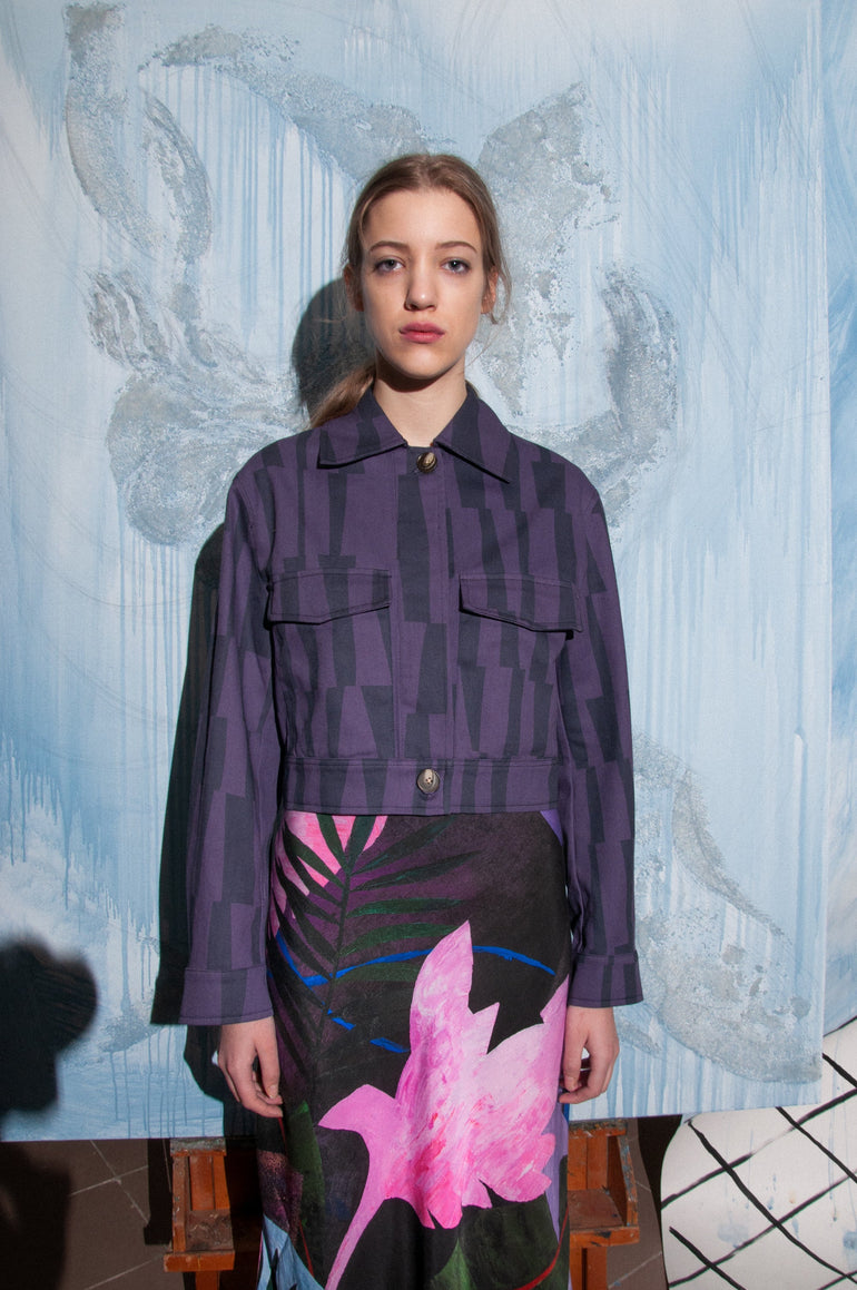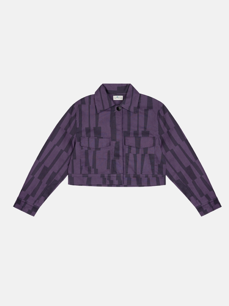 The Simplus Jacket has a cropped, relaxed fit. Front hidden button placket with the top button exposed. Horn style buttons. Straight sleeve with single button closure. Two front patch pockets with closure. Made from certified organic cotton twill, in custom artwork Accenda Night.