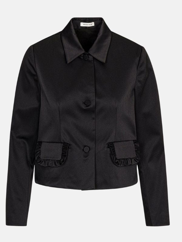 Featuring a sleek design with playful ruffle accents on the pockets, this jacket combines modern tailoring with a touch of femininity. Perfect for adding a sophisticated layer to any outfit.