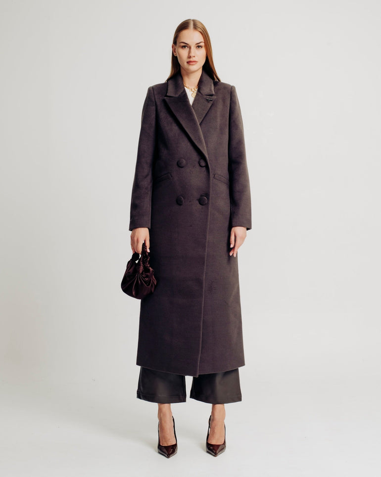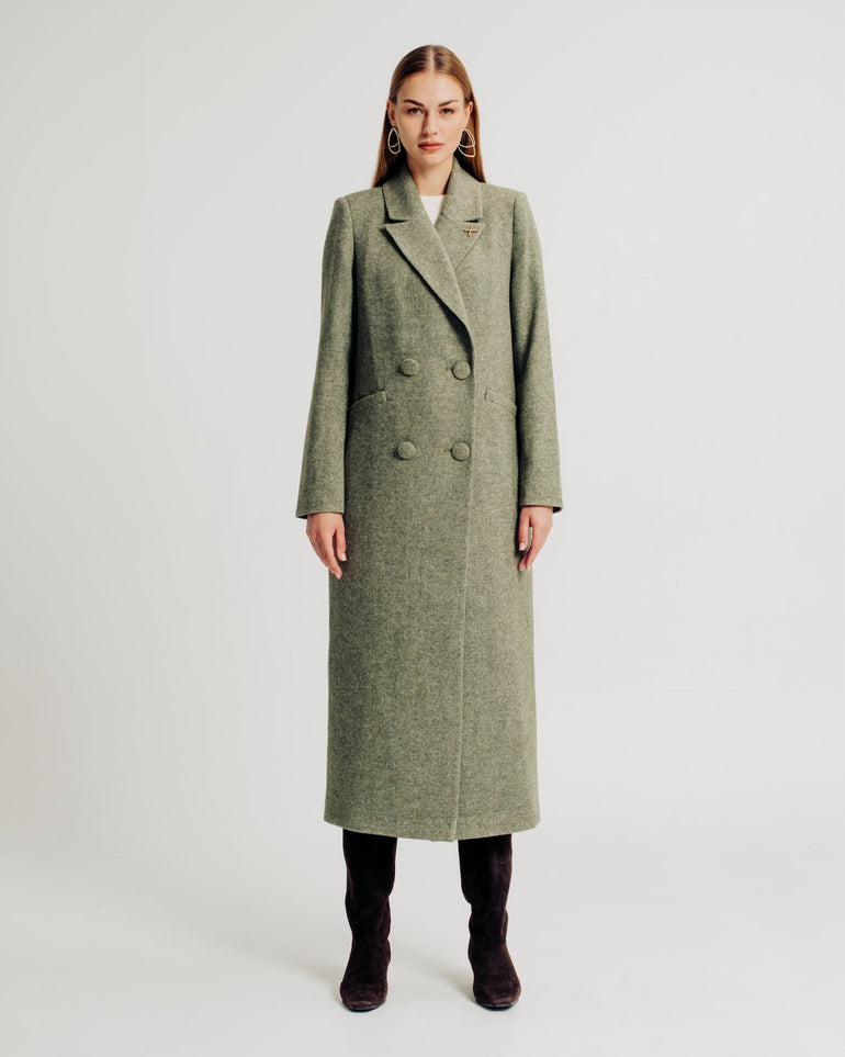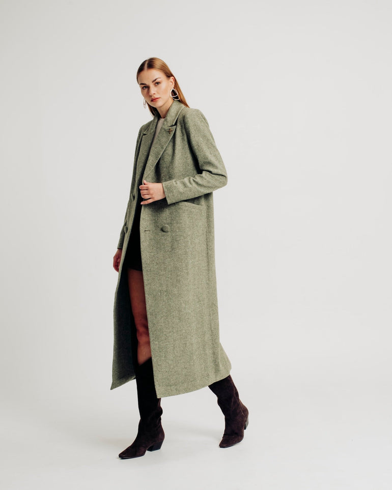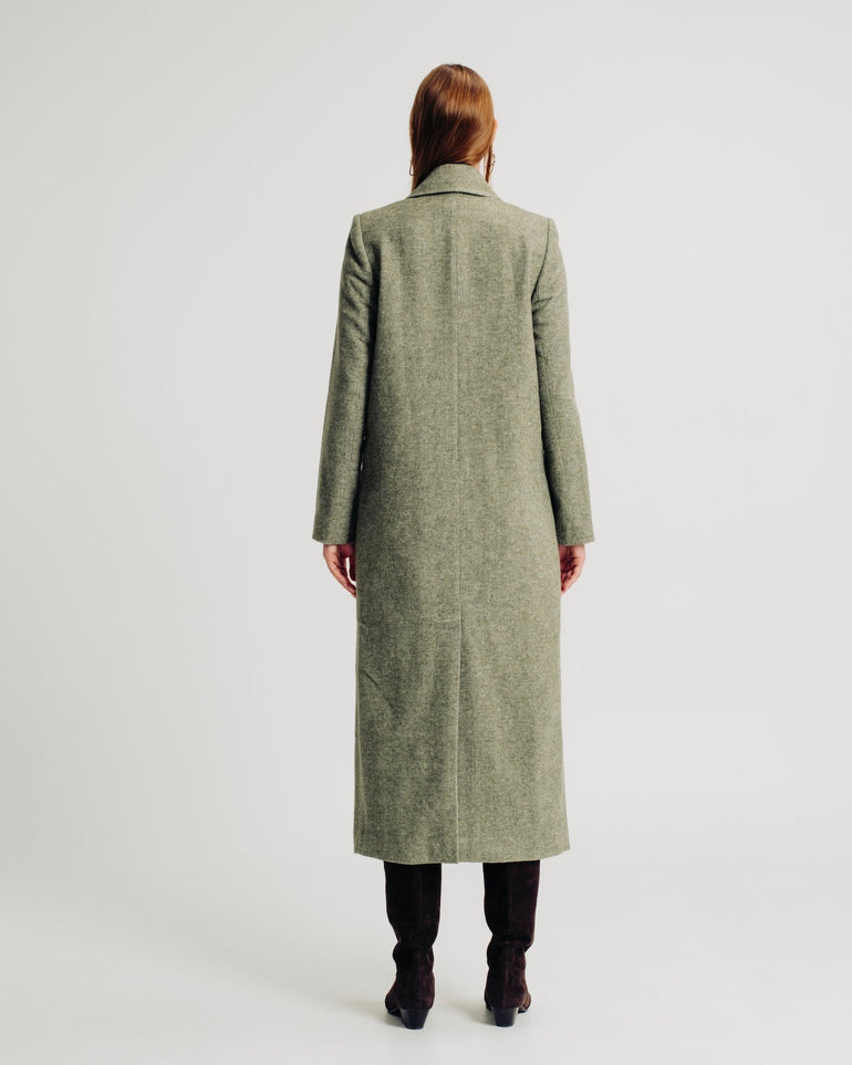 The Tyra Coat is an elongated overcoat, offering a refined and versatile look. It features a double-breasted design for a classic and tailored silhouette. The coat includes welt pockets for a sleek appearance and a trim detail at the left lapel, adding a subtle touch of sophistication. The Sable coat is a solid color doubleface weave, while the Moss coat is made in a textured wool-blend herringbone weave.