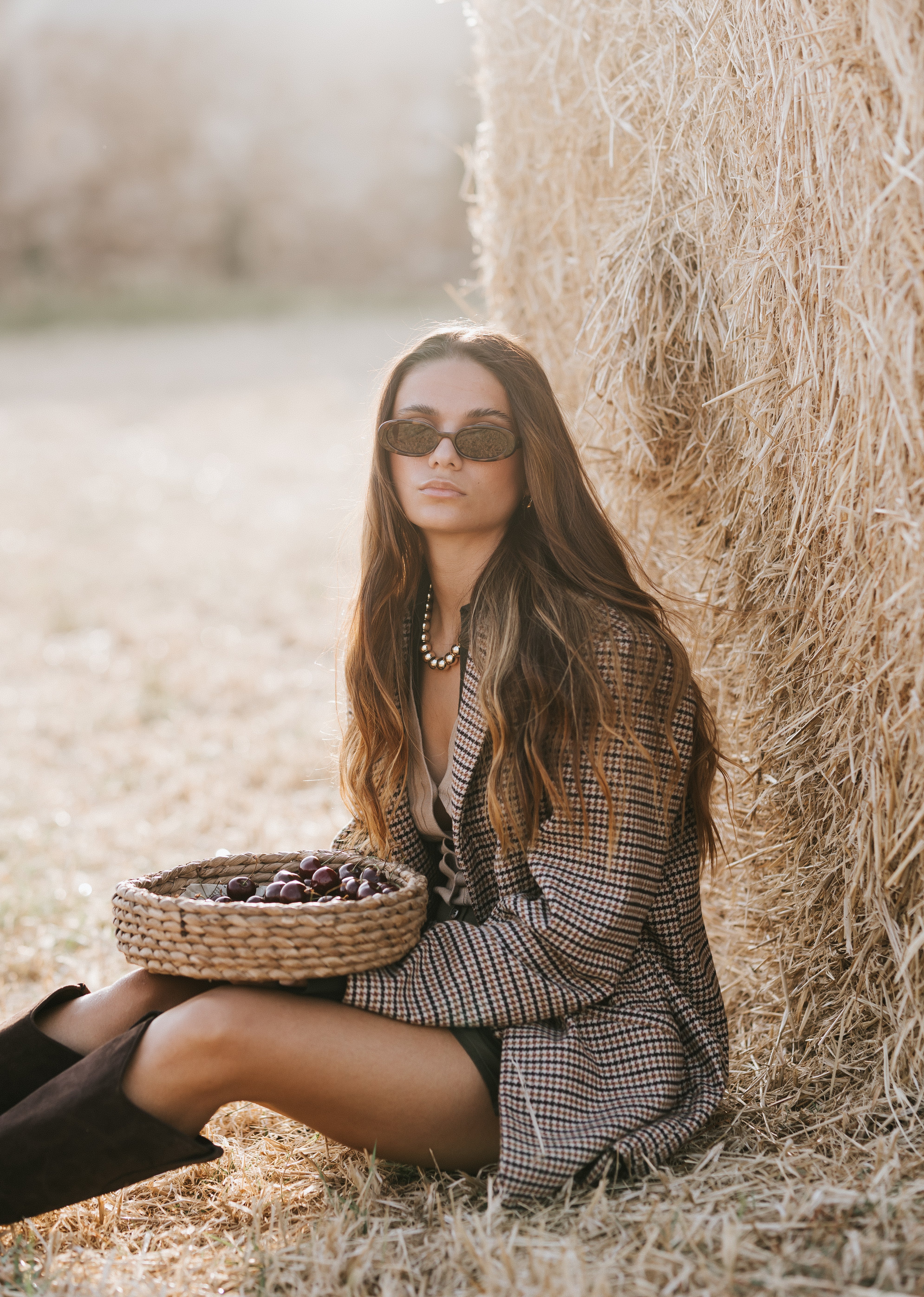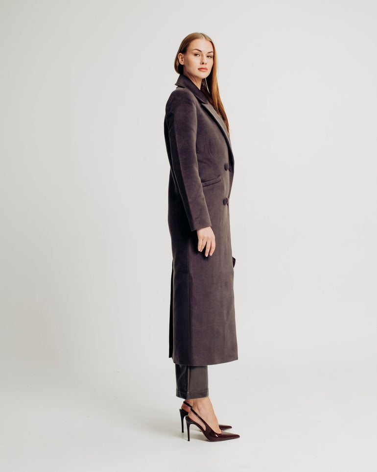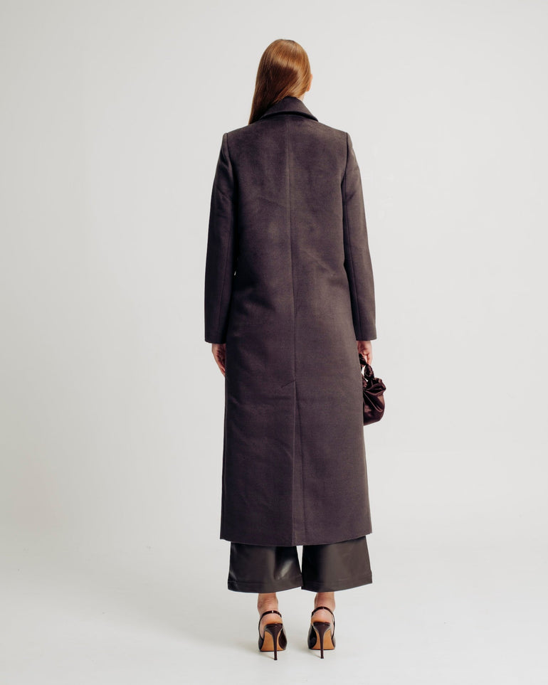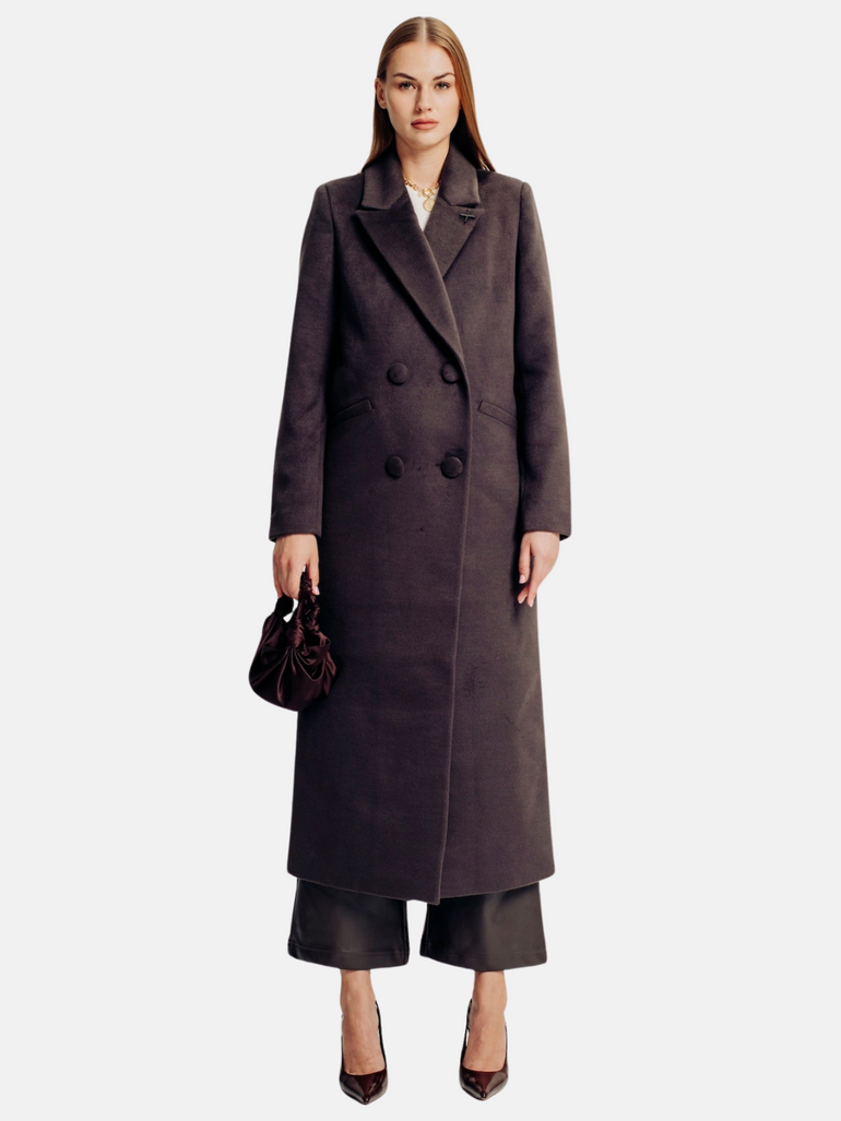 The Tyra Coat is an elongated overcoat, offering a refined and versatile look. It features a double-breasted design for a classic and tailored silhouette. The coat includes welt pockets for a sleek appearance and a trim detail at the left lapel, adding a subtle touch of sophistication. The Sable coat is a solid color doubleface weave, while the Moss coat is made in a textured wool-blend herringbone weave.