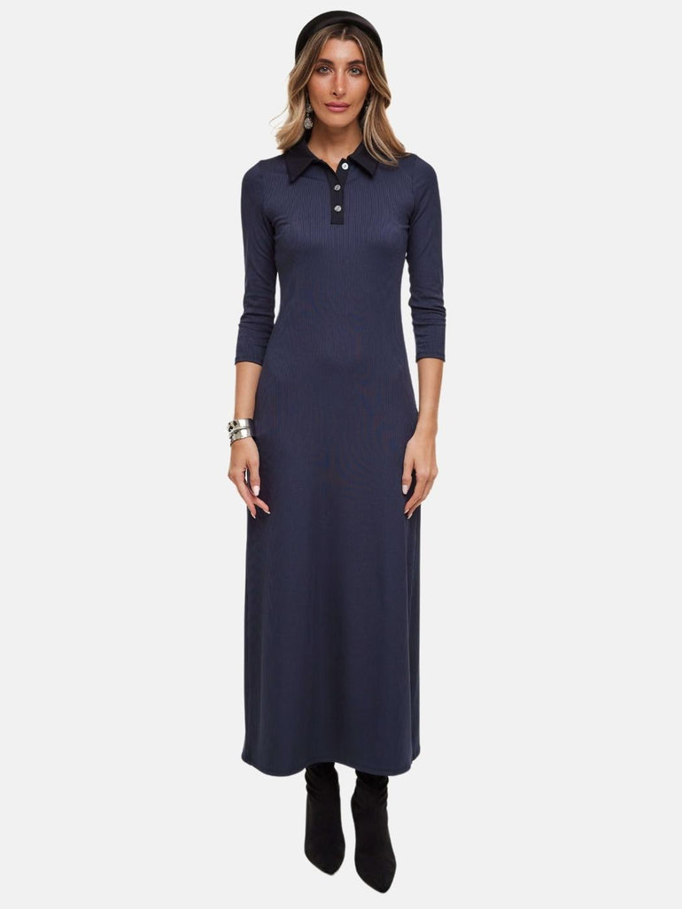 The Contrast Collared Rib Dress, now available in Navy/Black and Teal/Caramel, combines style and functionality. Crafted from luxurious ribbed fabric with OLIVVI's signature mother-of-pearl buttons, this 53" dress ensures a flattering fit with lasting comfort. Its versatile design, complete with a subtle back slit, can be styled with boots for a polished look or sneakers for a sporty vibe.