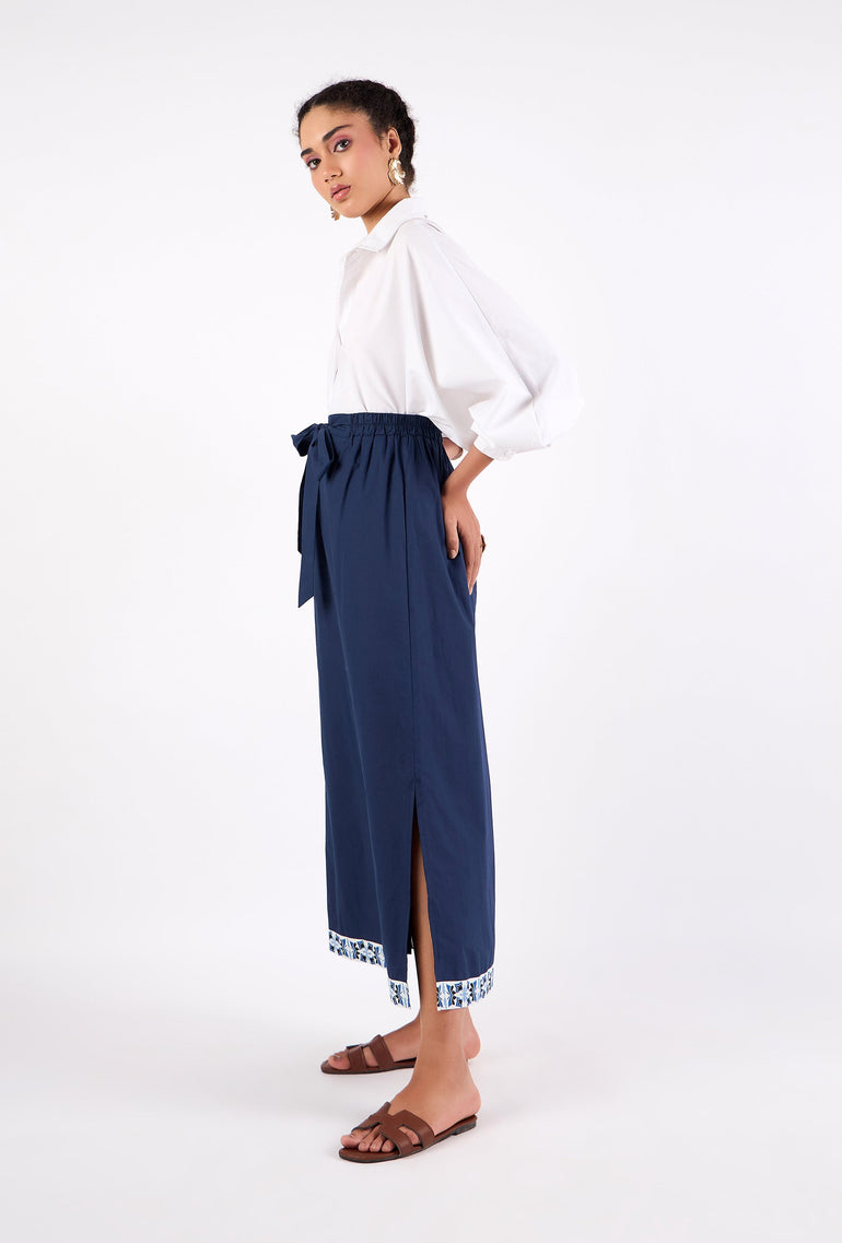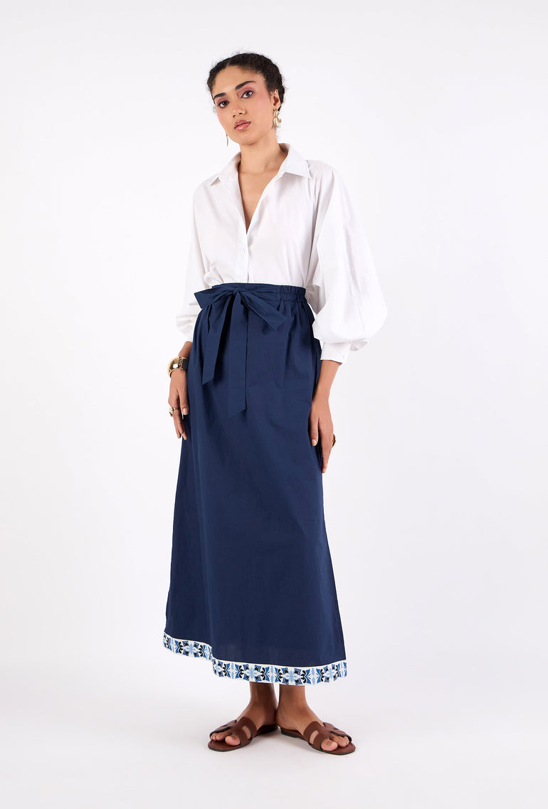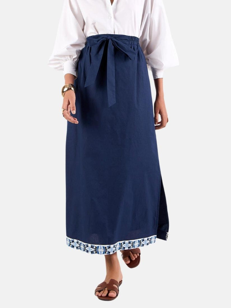 With its straight shape, hidden pockets and banded waist featuring back elastic, the Tyler skirt exudes understated sophistication. Complete with a removable tie sash, subtle side slits, and a fully lined construction, it's a versatile must-have for any wardrobe. Tyler is crafted from breathable premium Cotton Poplin.