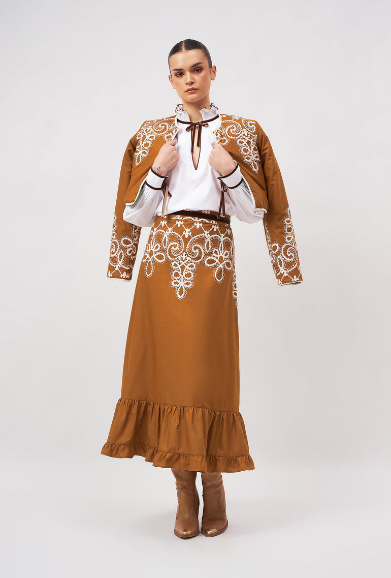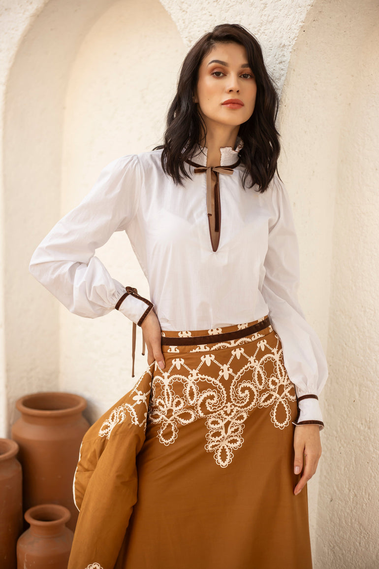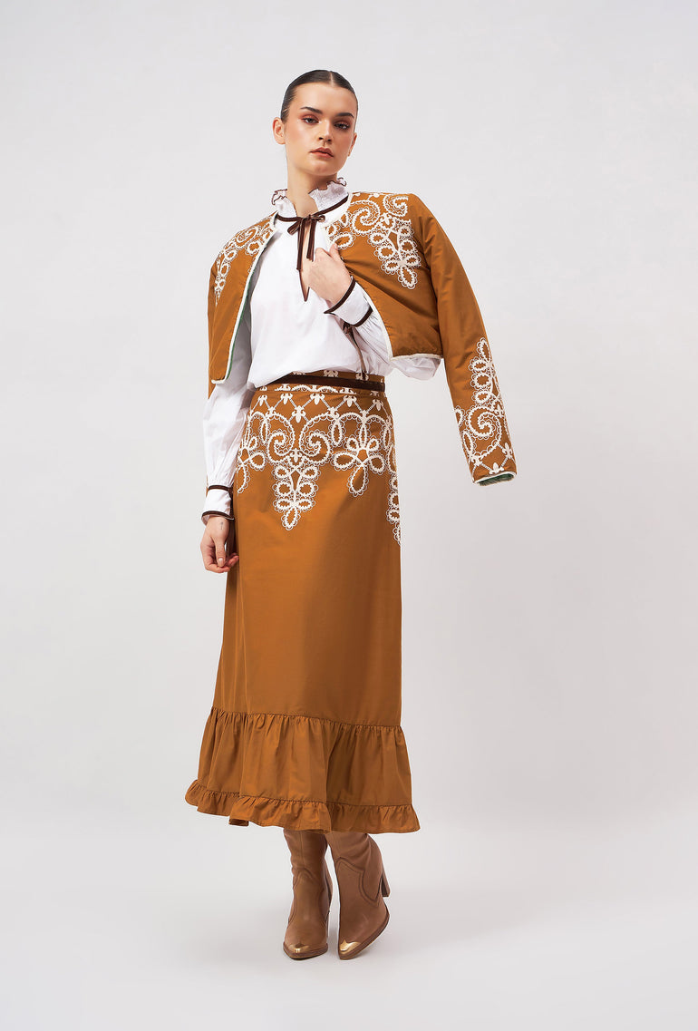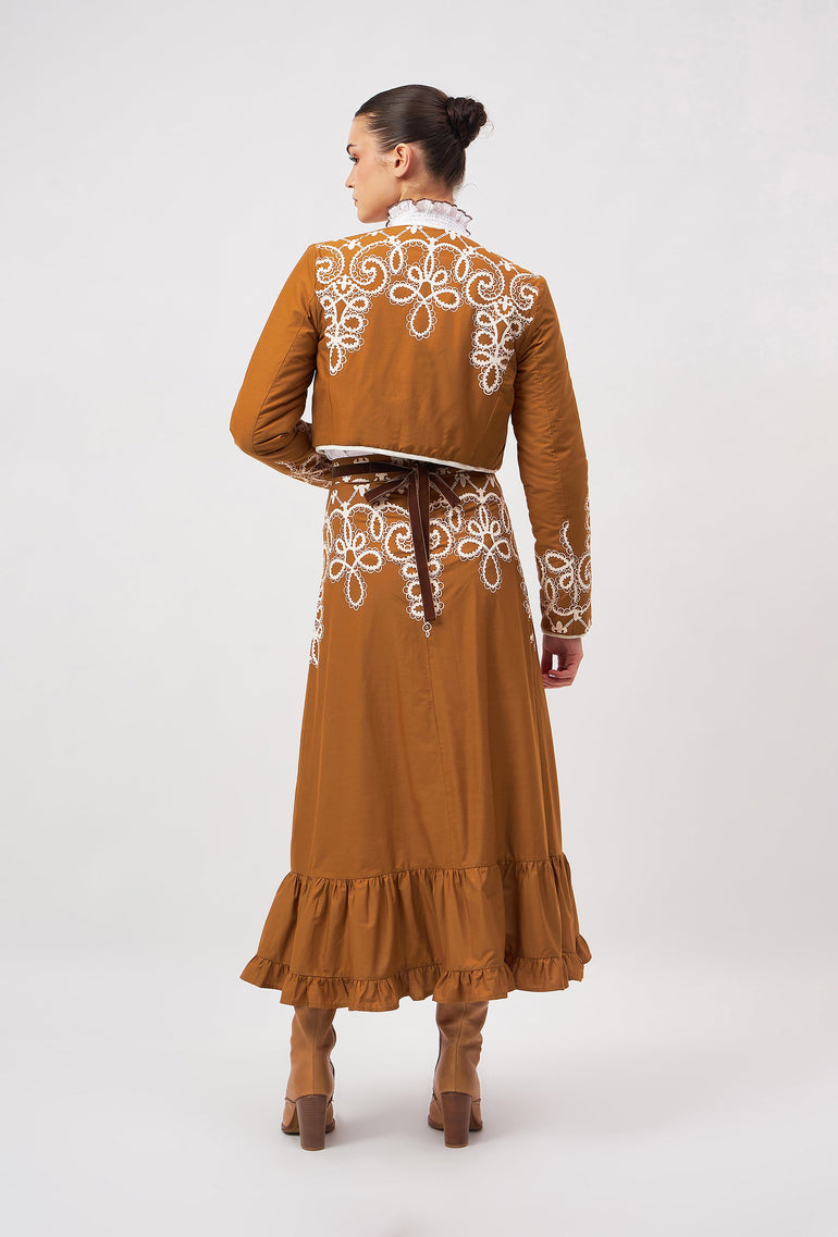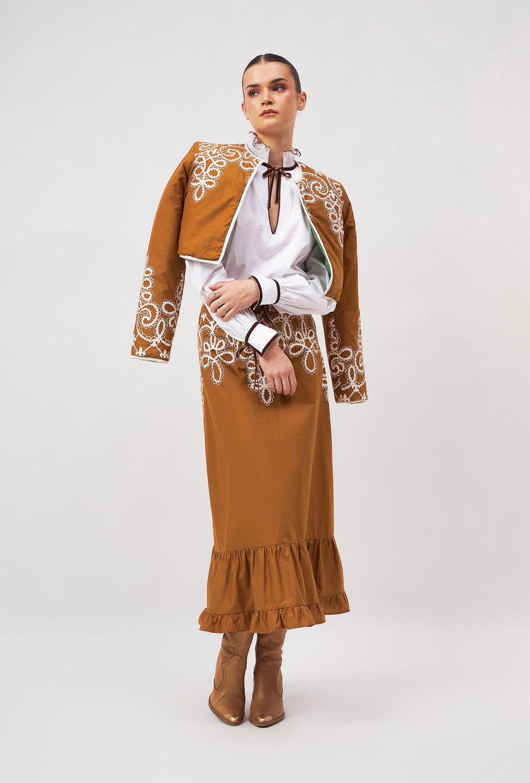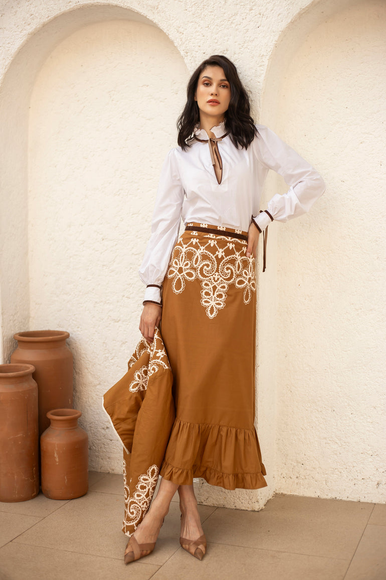 Introducing the Aurora, a flattering midi skirt for all occasions. Her high waist and adjustable velvet belt guarantee a flawless fit. The slender A-line falls to an elegant ruffled hem. Style her casually with flats or pair the Aurora with heels for a festive flair. “Medina” channels the elegance and craftsmanship of a Moroccan vintage bridal gown. The artwork pays homage to the intricate lacework and delicate embroidery traditionally hand-sewn onto heavy silks and brocade.