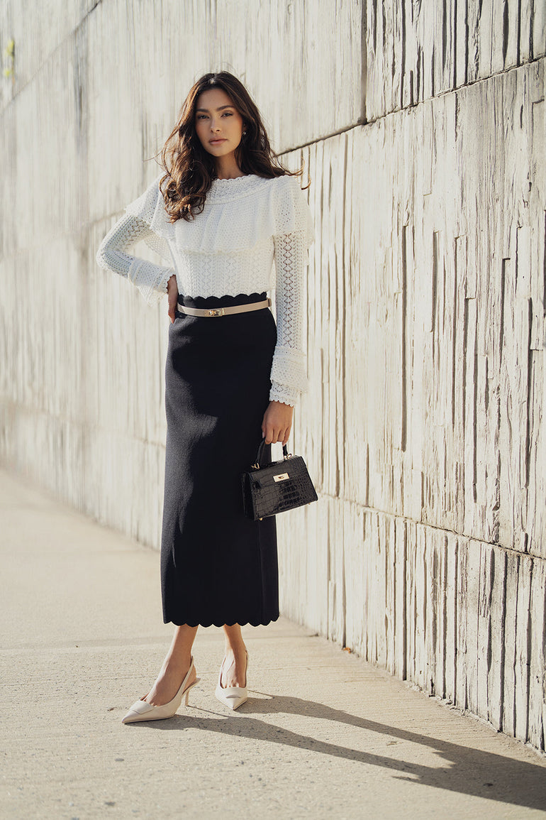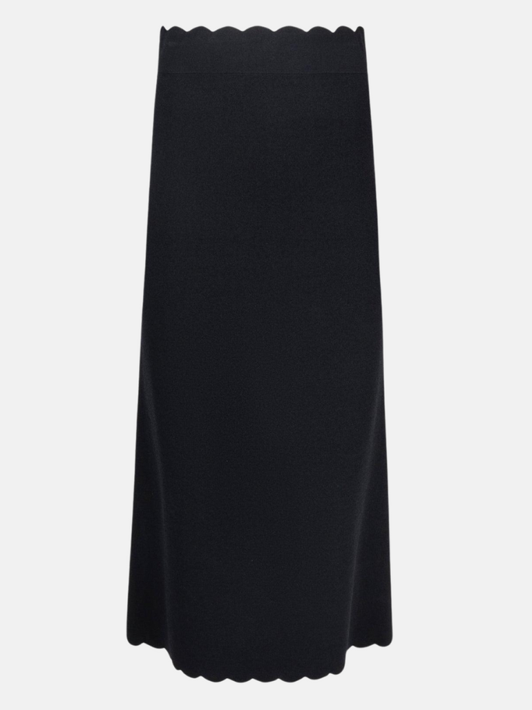 The Scalloped Knit Skirt features an elegant A-line silhouette and a graceful maxi length. This skirt combines classic design with modern sophistication for a timeless look.