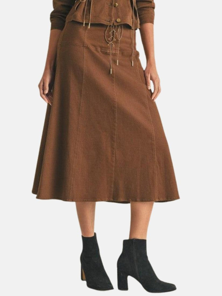 This mid-length Skirt is made of very soft and stretchable twill fabrication and features lace-up detailing and back zipper in A-line fit.