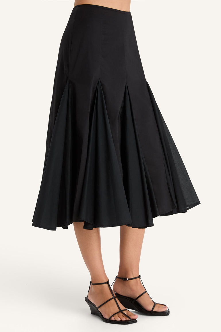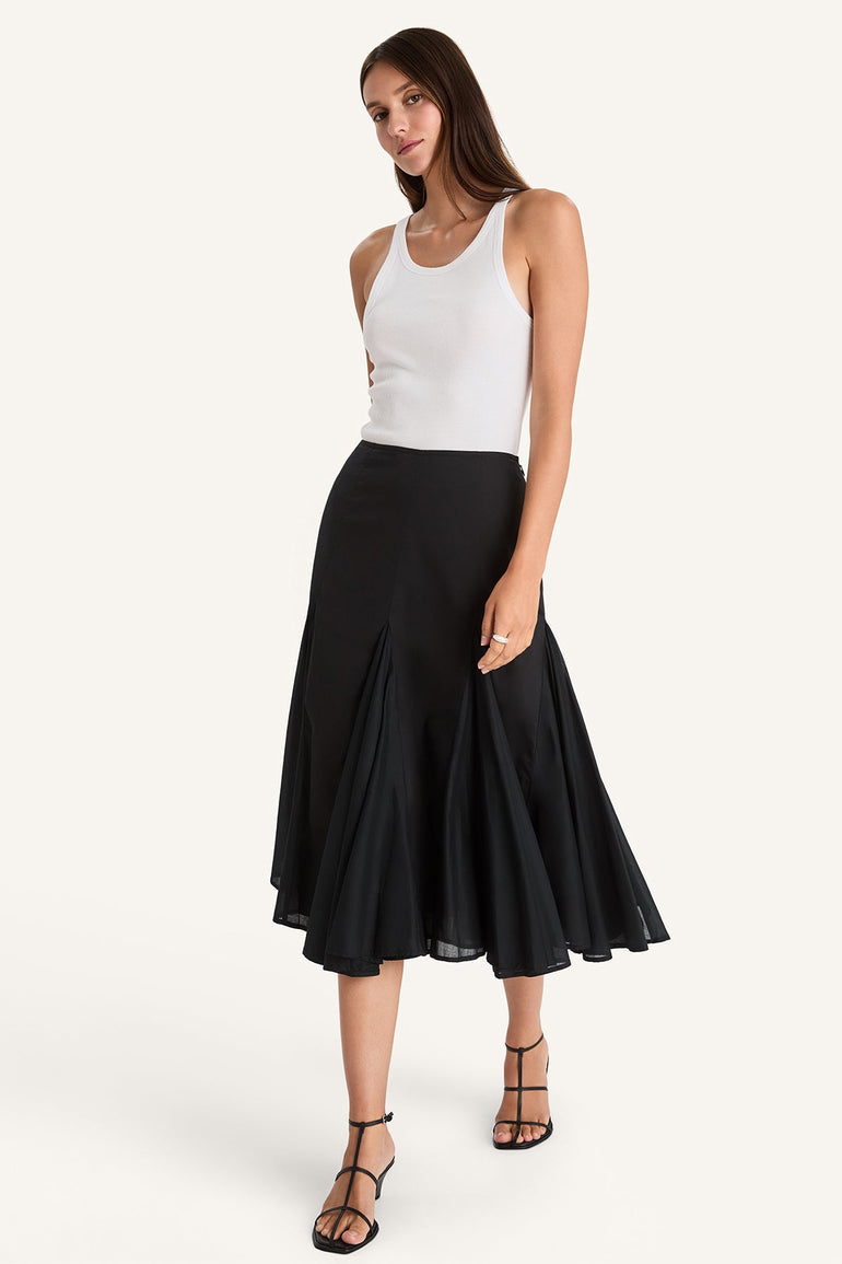 Crafted from luxurious 100% Pima cotton lawn-known for its soft, breathable texture-the ISADORA Skirt is a flattering midi length that falls gracefully below the knee. This style flares out gracefully with contrasting voile godets, creating movement with every stride. Fitted along the waistline, it flatters your figure while offering ease of movement. Style it back to the MAVIS Top.