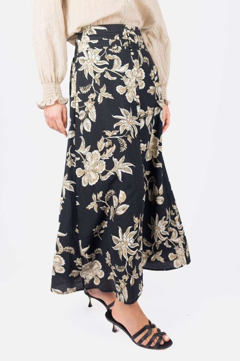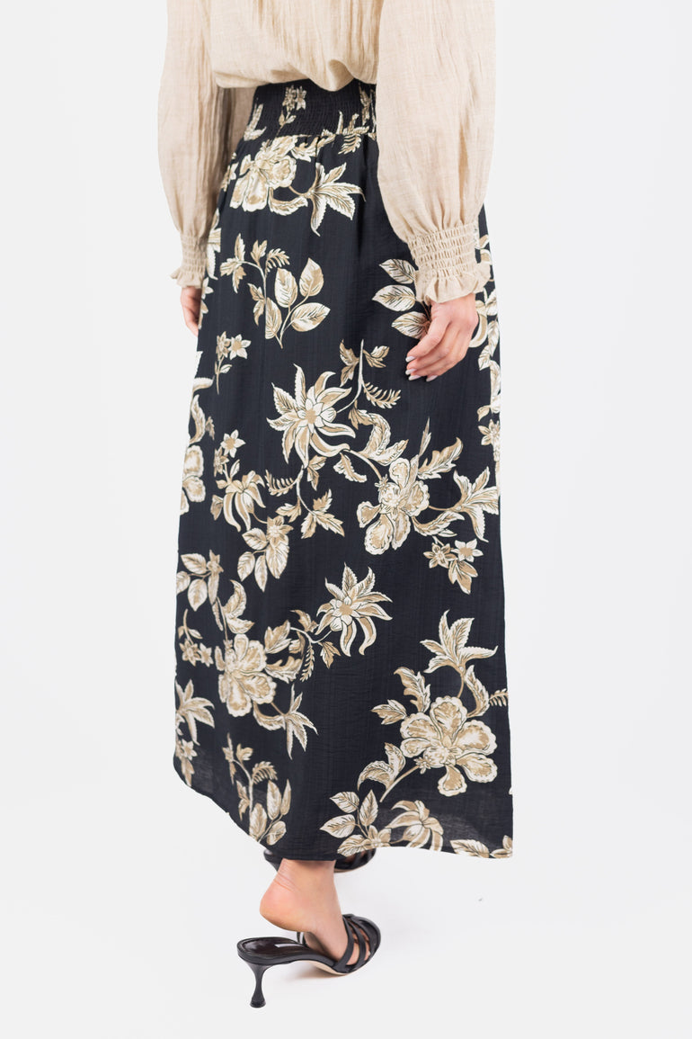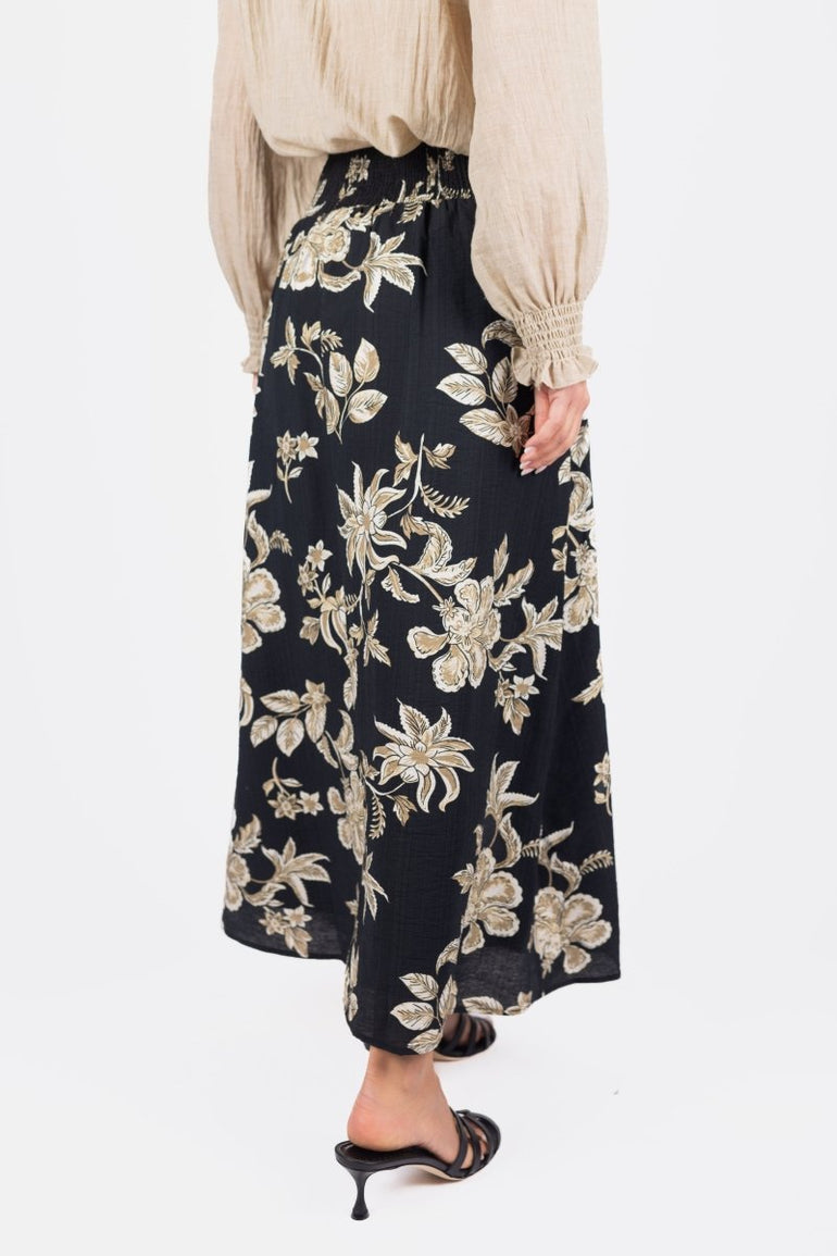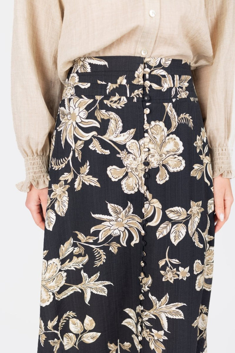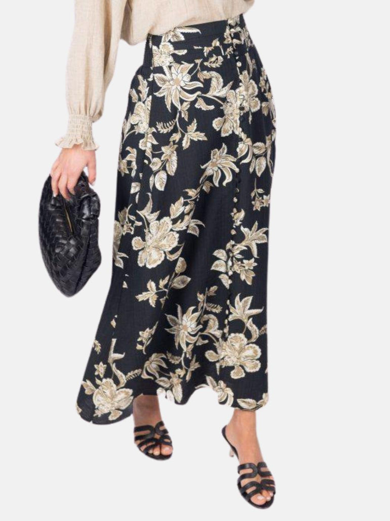 This is a black and gold floral midi skirt with an elegant and sophisticated design. It features a high-waisted silhouette with delicate fabric-covered buttons running down the front, adding a refined vintage touch. The intricate golden floral print contrasts beautifully against the deep black background, creating a timeless and chic aesthetic. The slightly flared hemline enhances movement and flow, making this skirt perfect for both casual and dressy occasions. Pair it with a fitted top or a blouse for an effortlessly polished look.