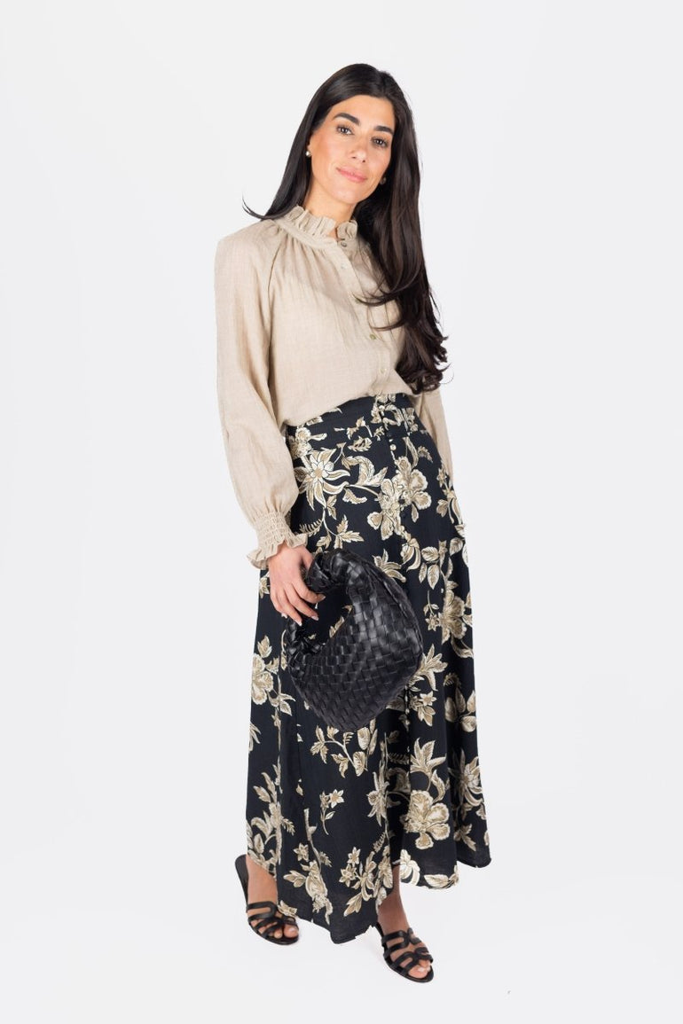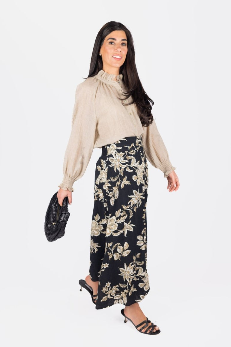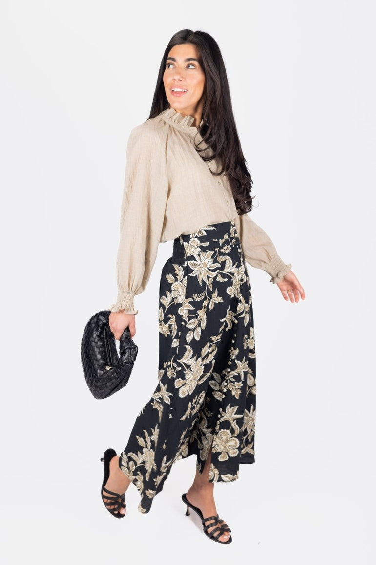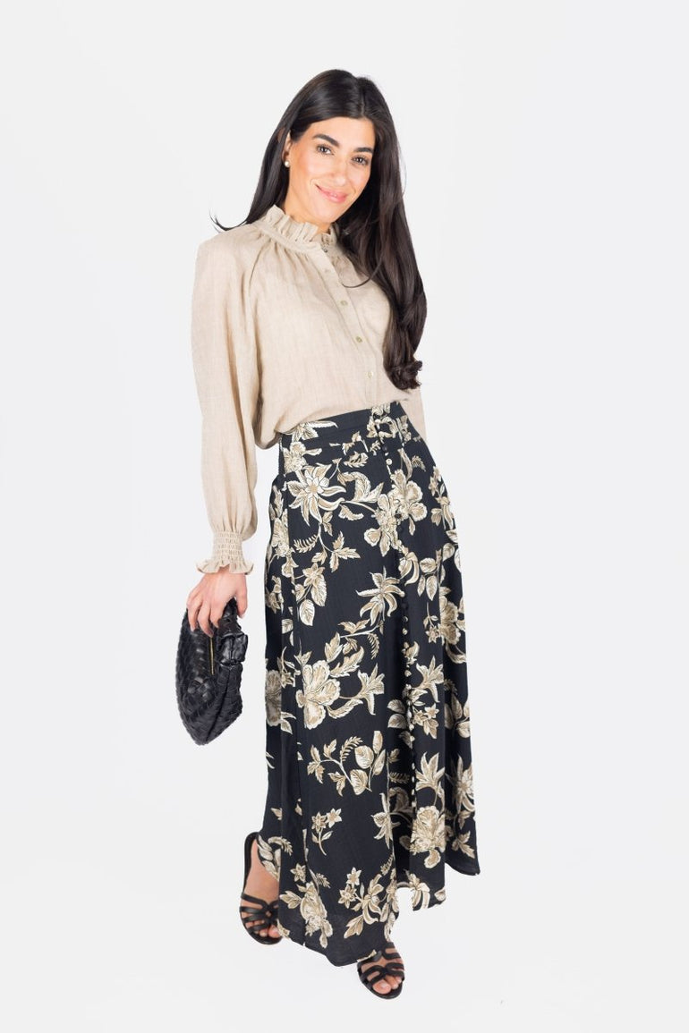 This is a black and gold floral midi skirt with an elegant and sophisticated design. It features a high-waisted silhouette with delicate fabric-covered buttons running down the front, adding a refined vintage touch. The intricate golden floral print contrasts beautifully against the deep black background, creating a timeless and chic aesthetic. The slightly flared hemline enhances movement and flow, making this skirt perfect for both casual and dressy occasions. Pair it with a fitted top or a blouse for an effortlessly polished look.