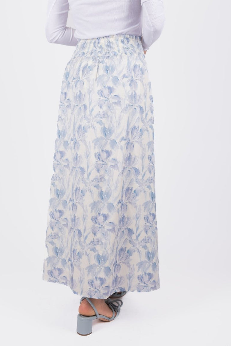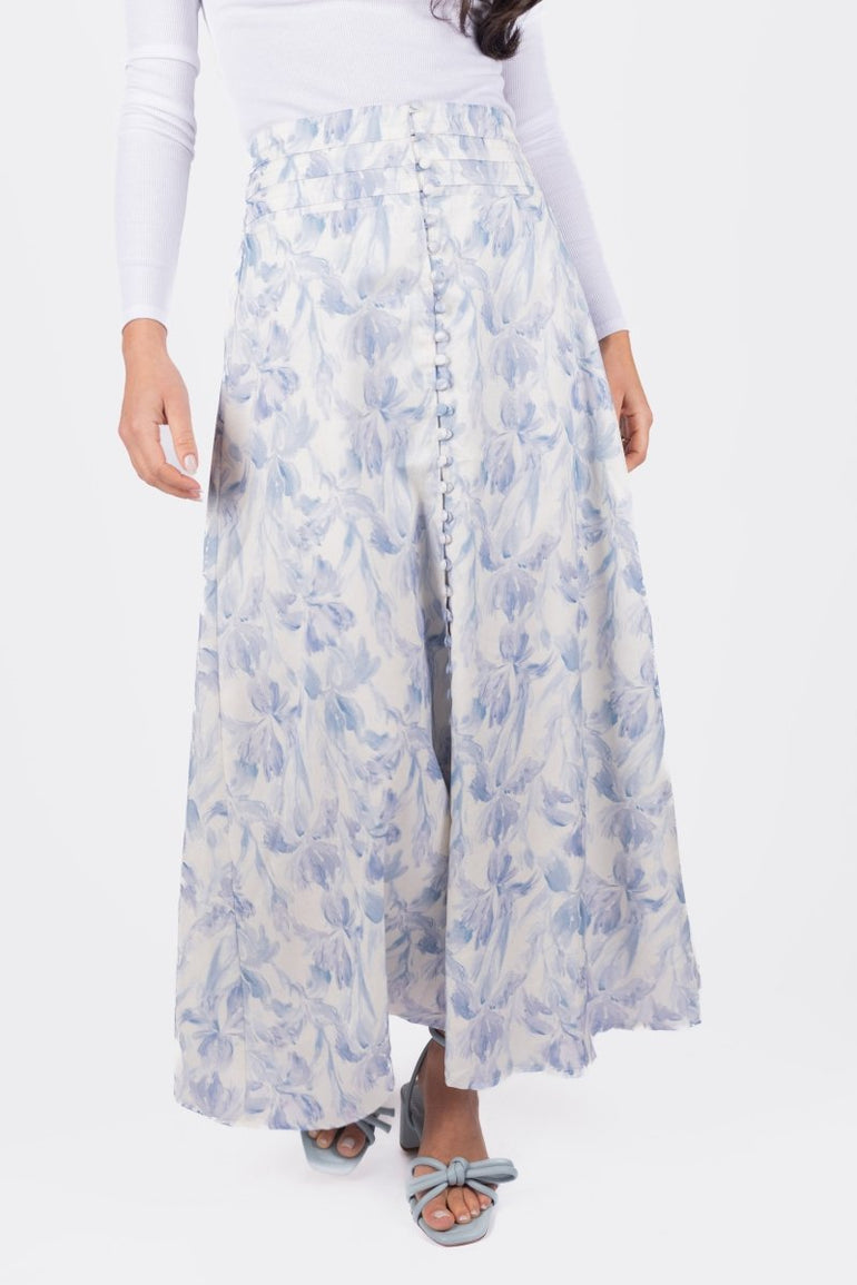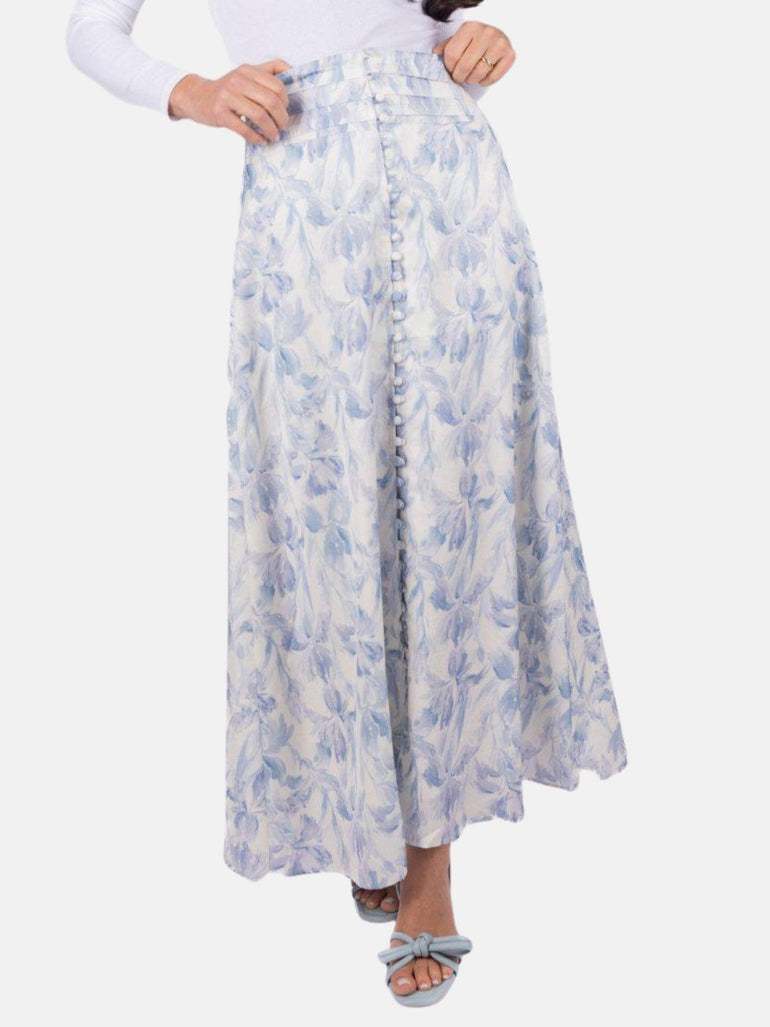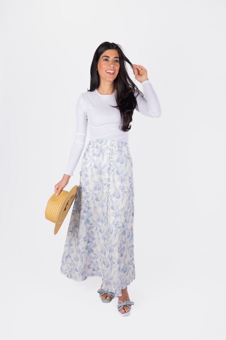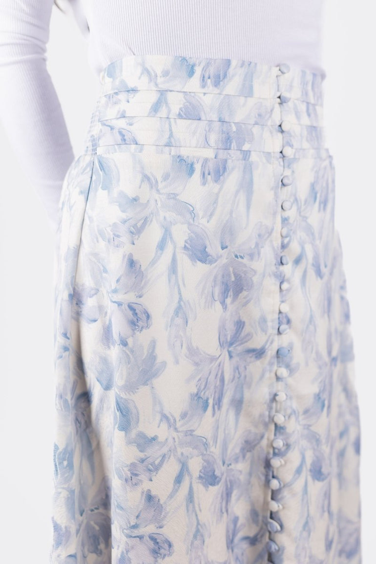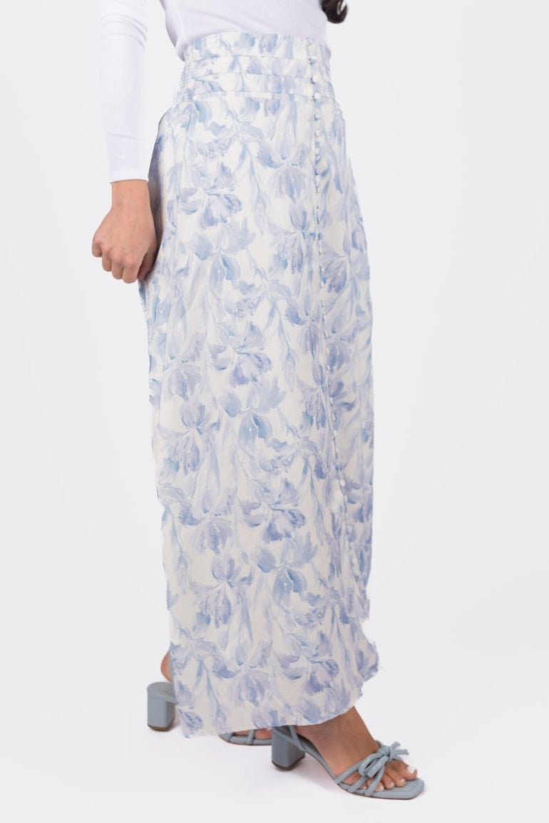 This elegant maxi skirt features a delicate blue floral print on a soft white background, evoking a timeless and feminine charm. The high-waisted silhouette is accentuated with subtle pleating and a row of dainty buttons for an extra touch of sophistication. Crafted from lightweight fabric, this skirt flows gracefully with every step, making it a perfect choice for both casual outings and special