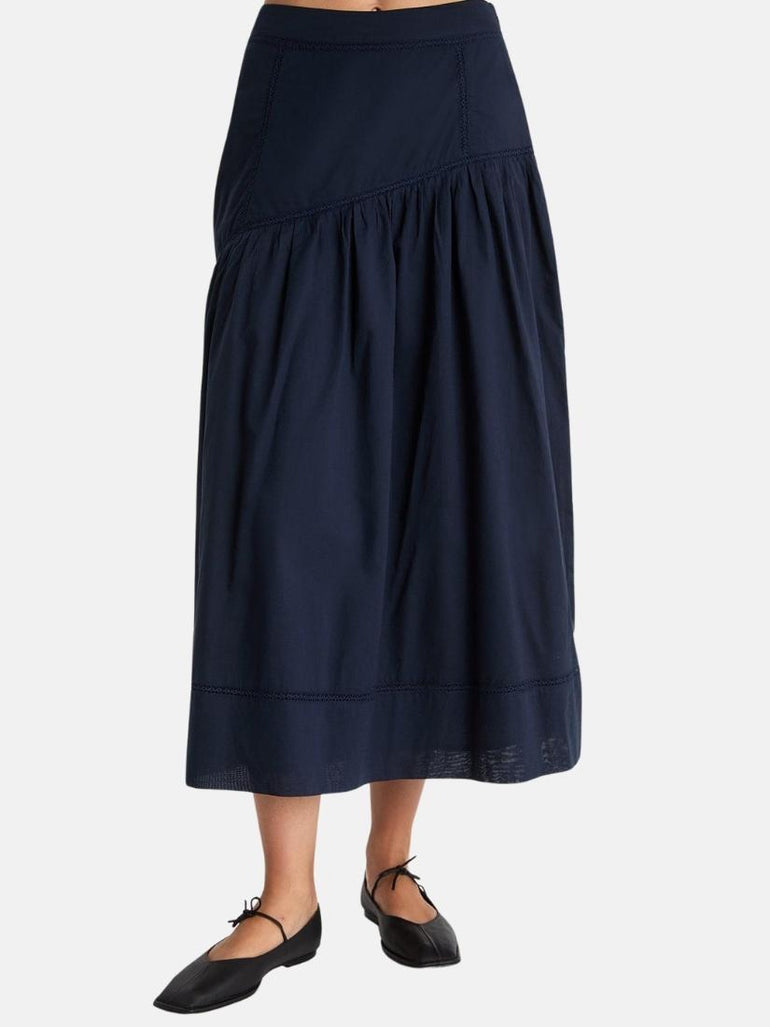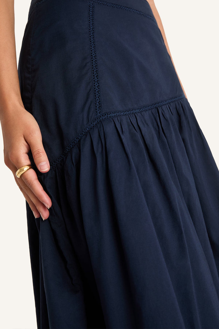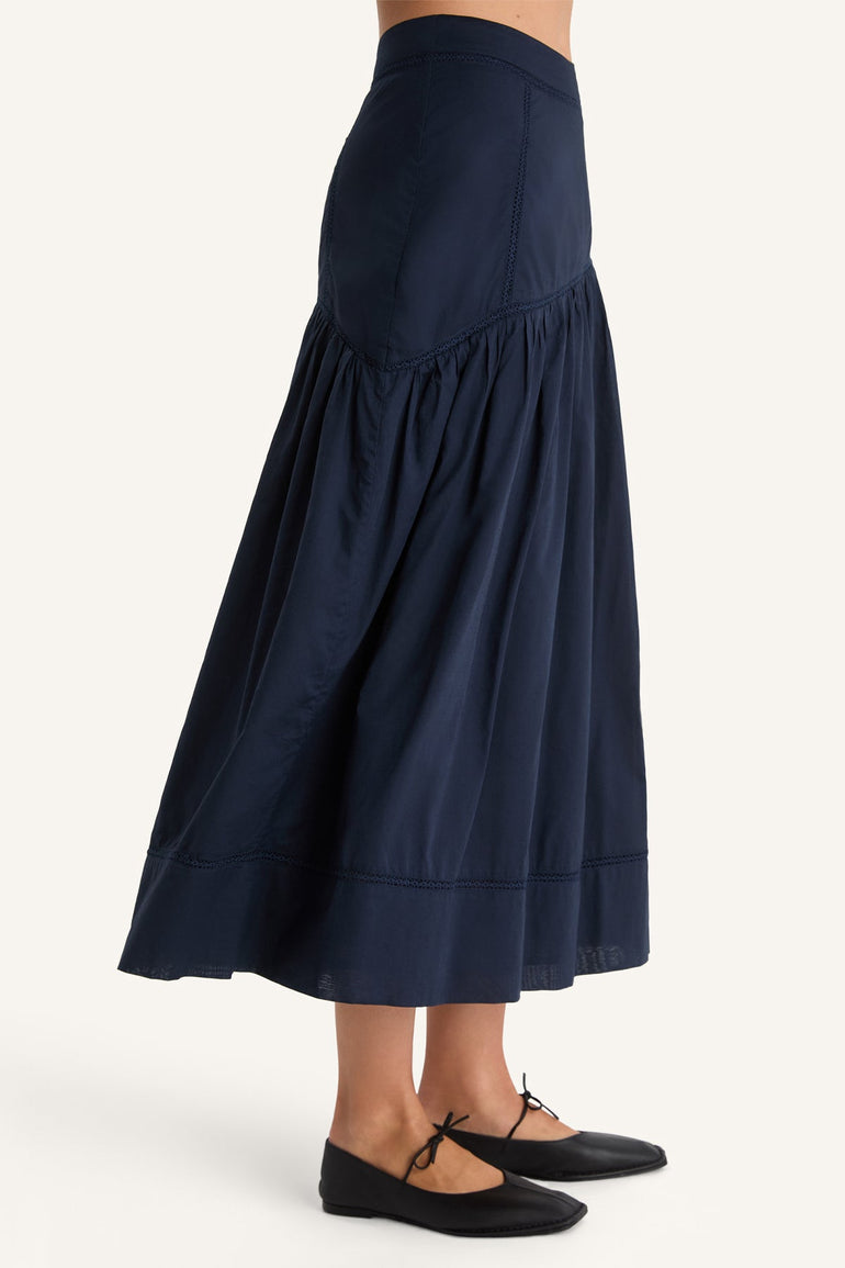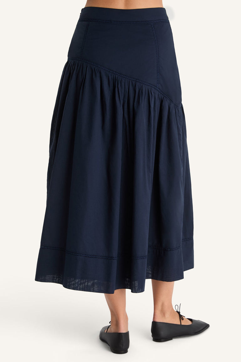 The LAWRENCE Skirt is detailed with asymmetrical tiers and accented with inset lace along the edges and hemline, that create beautiful movement and texture. Fitted through the waist, this skirt flatters your silhouette while offering a flowy, ethereal drape. Pair it with the coordinating ELLES Top.
