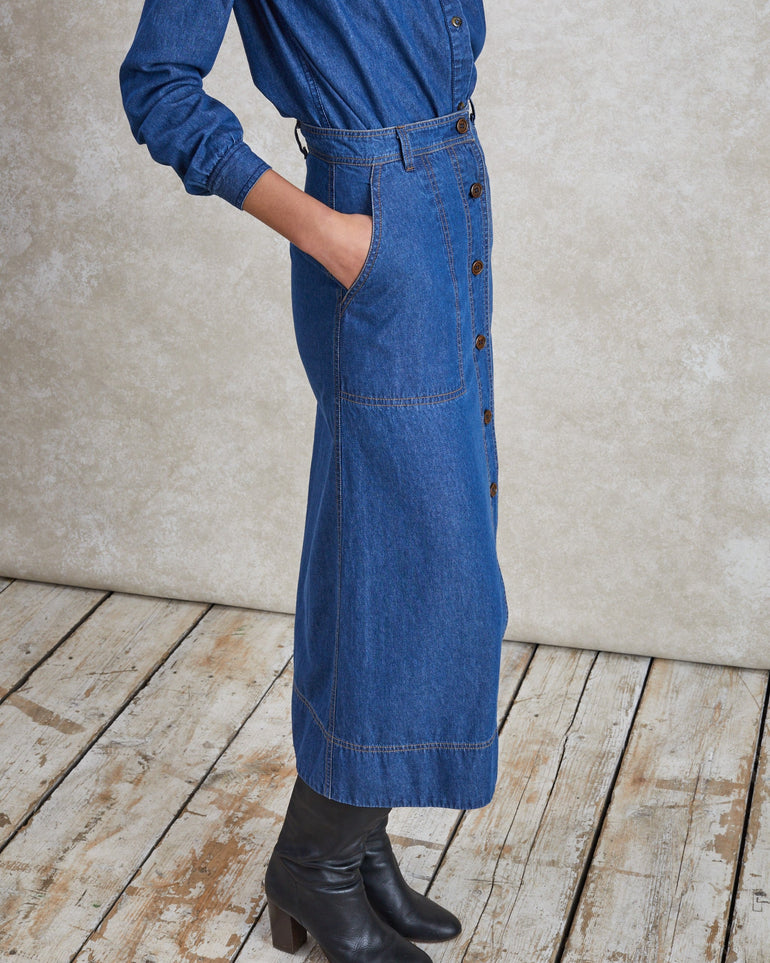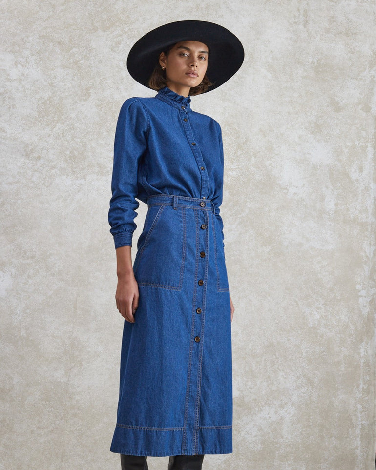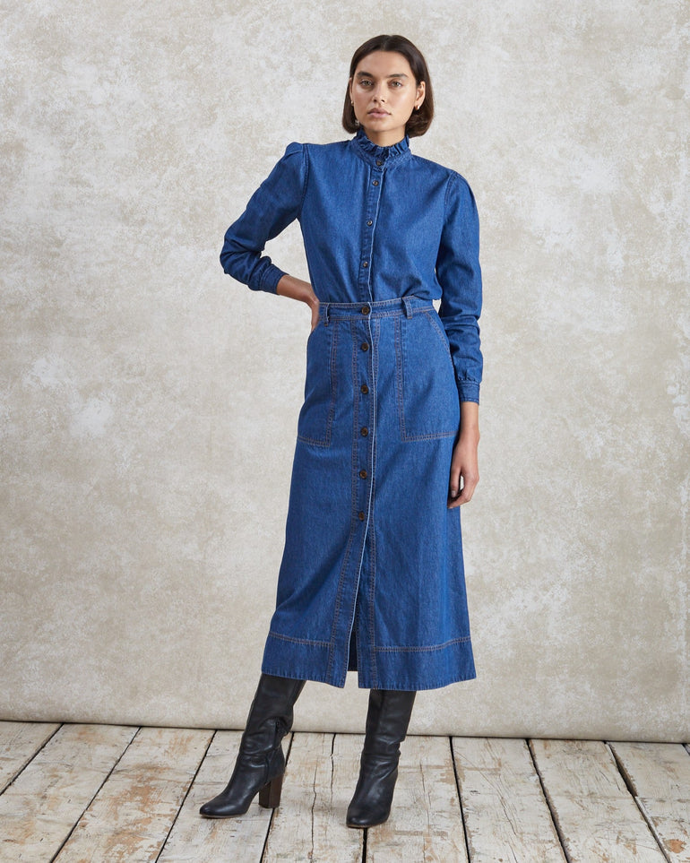There are denim skirts and then there is Mabel. Our take on a wardrobe classic is '70s-tinged, with a high waist, buttoned front, midi length and figure-skimming silhouette – all rendered in true-blue cotton-denim. Considered details are important to us, which is why we've incorporated traditional stitch detailing, belt loops and pockets. Tuck in the coordinating Poppy shirt and finish with knee-high boots and vintage costume jewellery.