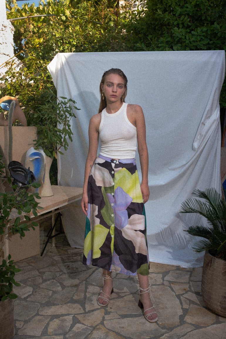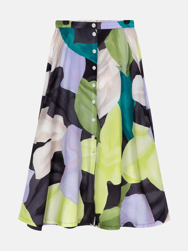 The Maritus skirt features UIM custom abstract artwork Maniera. Beautiful easy fit midi length skirt crafted from breathable TENCEL™ with silky twill finish. Front button closure and elasticized waist at back.