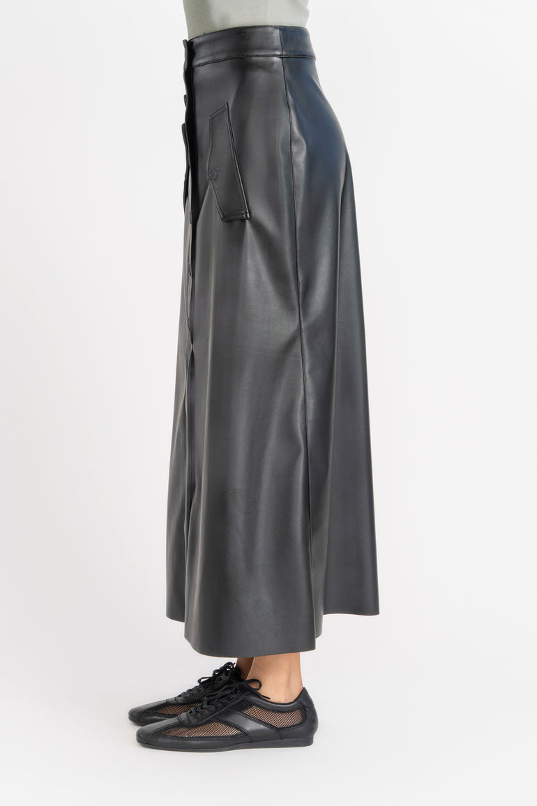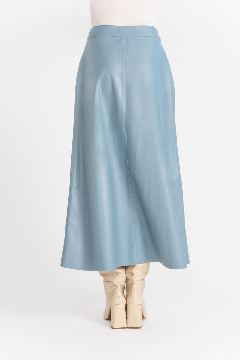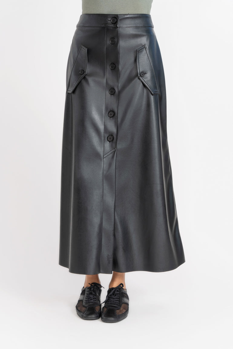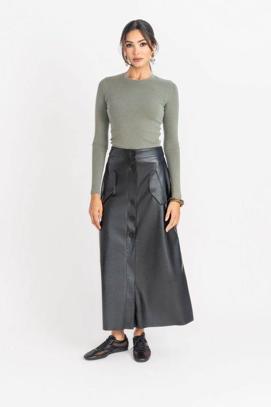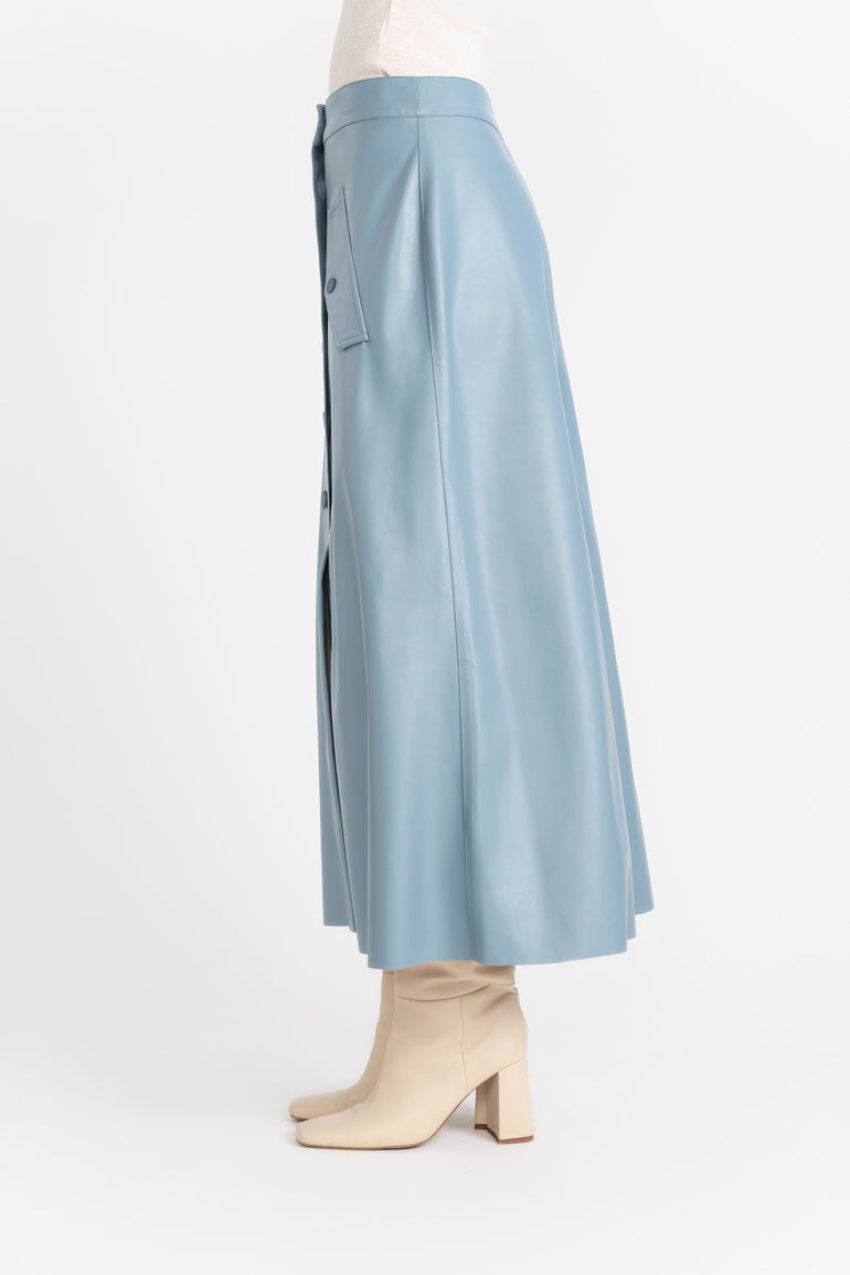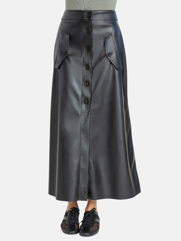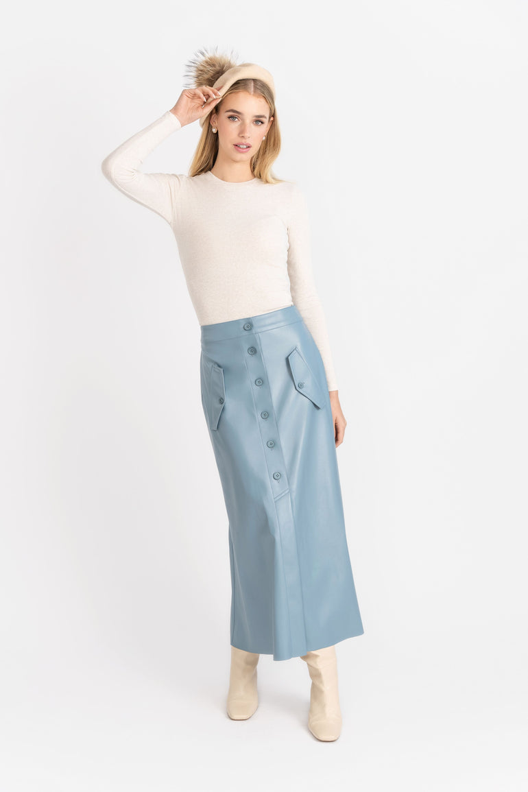 The Vegan Leather Maxi Skirt is a sophisticated and unique piece crafted from high-quality vegan leather. Its maxi length, combined with decorative buttons on the front, makes the Vegan Leather Maxi Skirt an elegant and modern option that elevates any outfit. Available in Light Blue Pleather and Black Pleather.