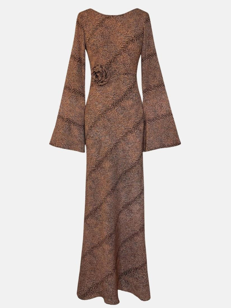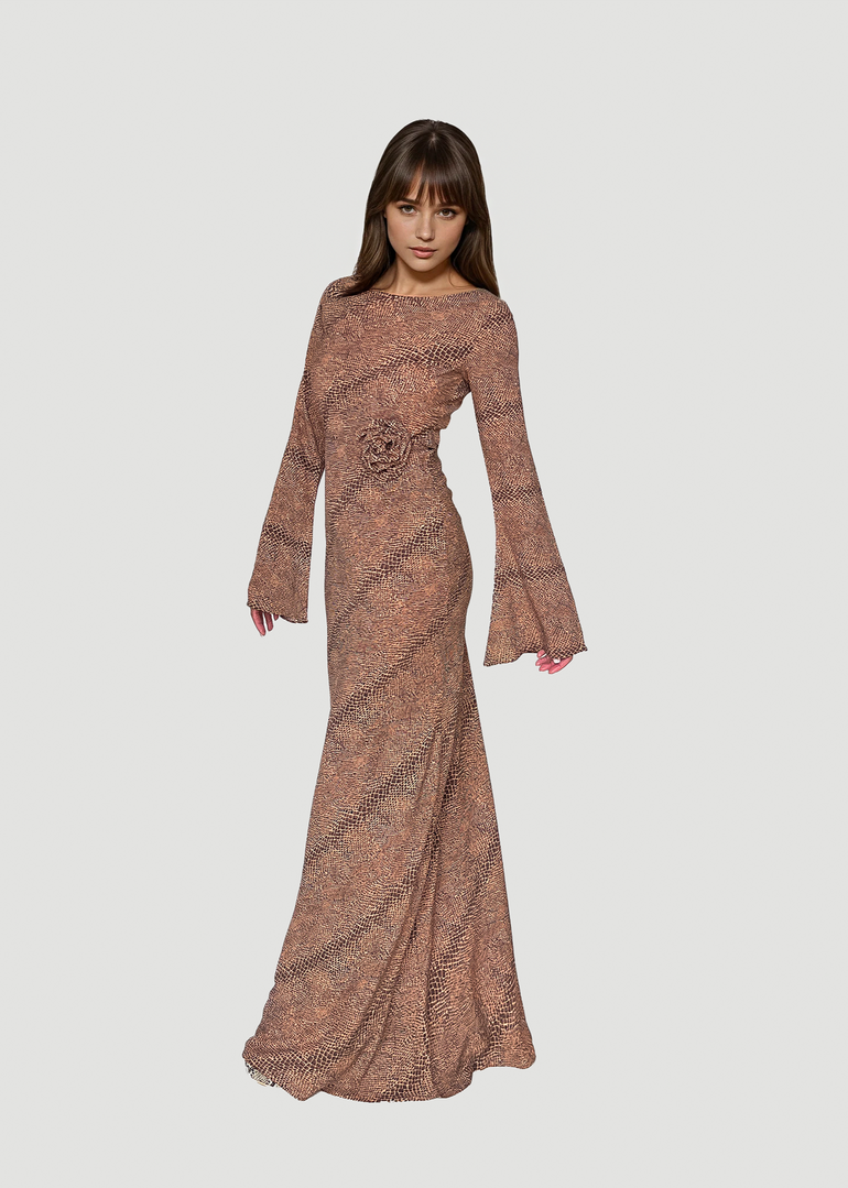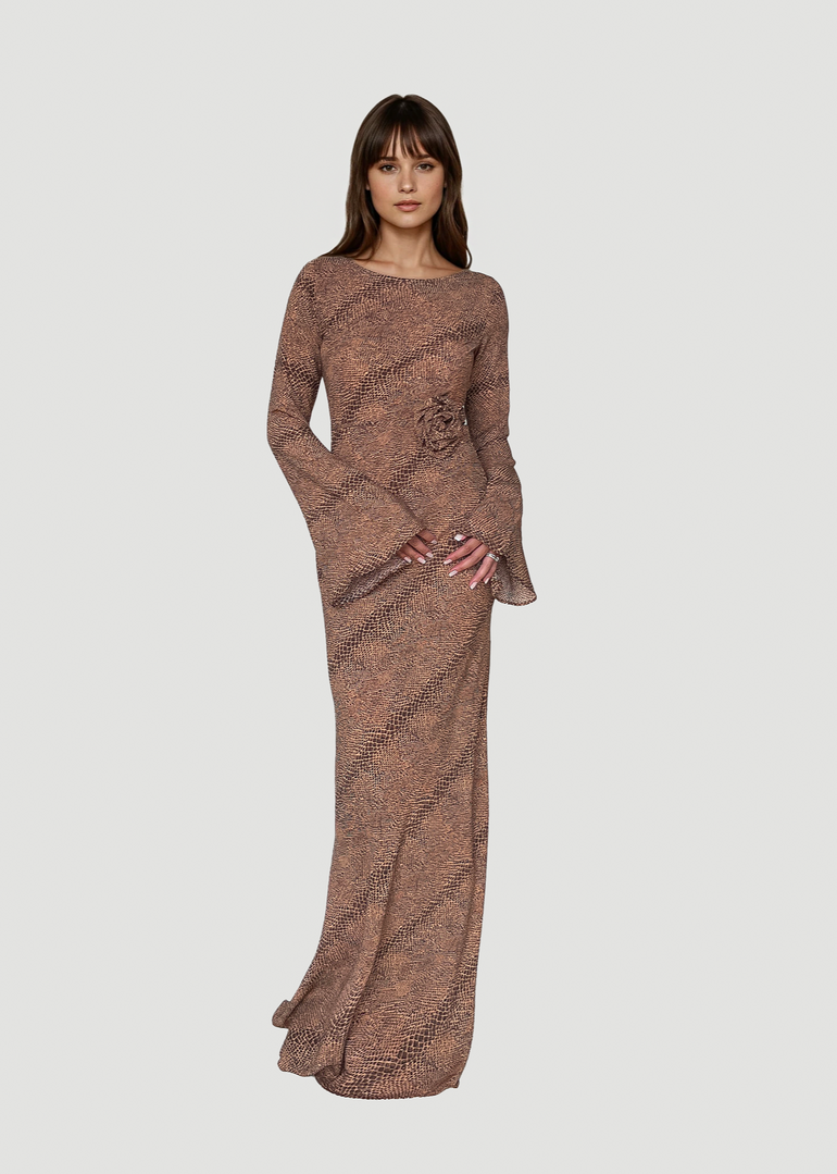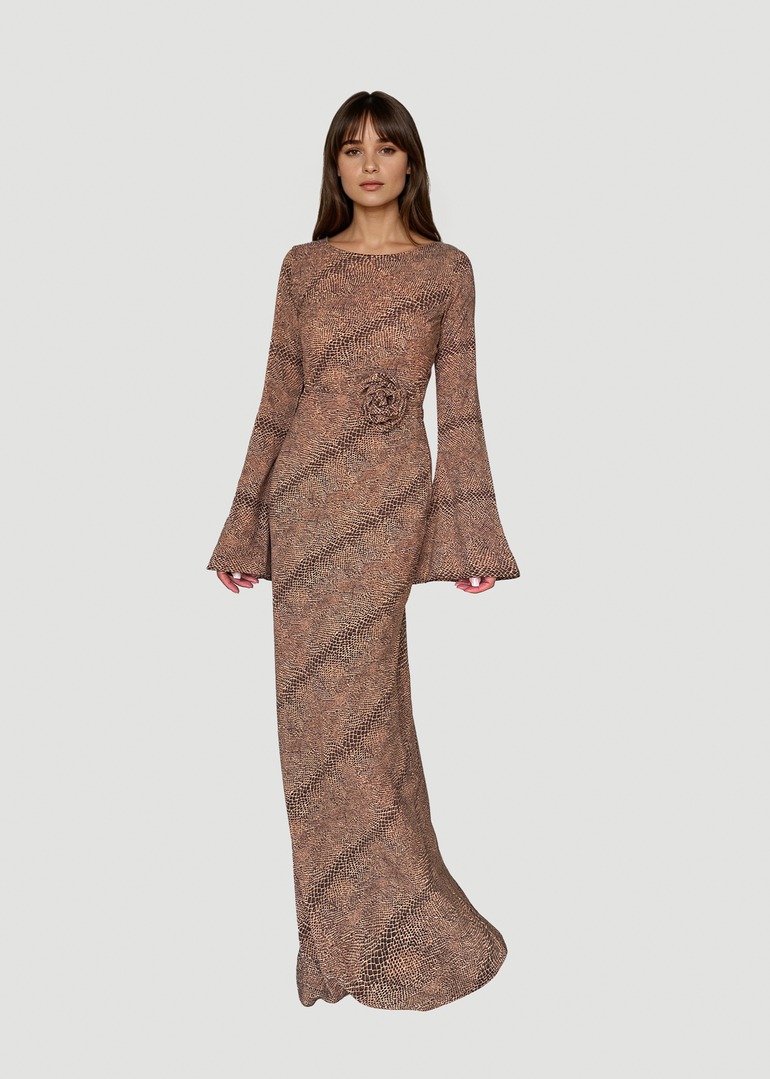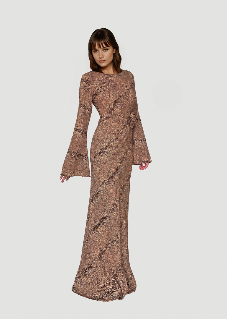 Featuring a stunning Cobra print, statement bell sleeves, and bias cut that flows on the body for a beautiful silhouette, the KYRA bias maxi dress is sure to turn heads. The maxi length makes it a must-have for your wardrobe.