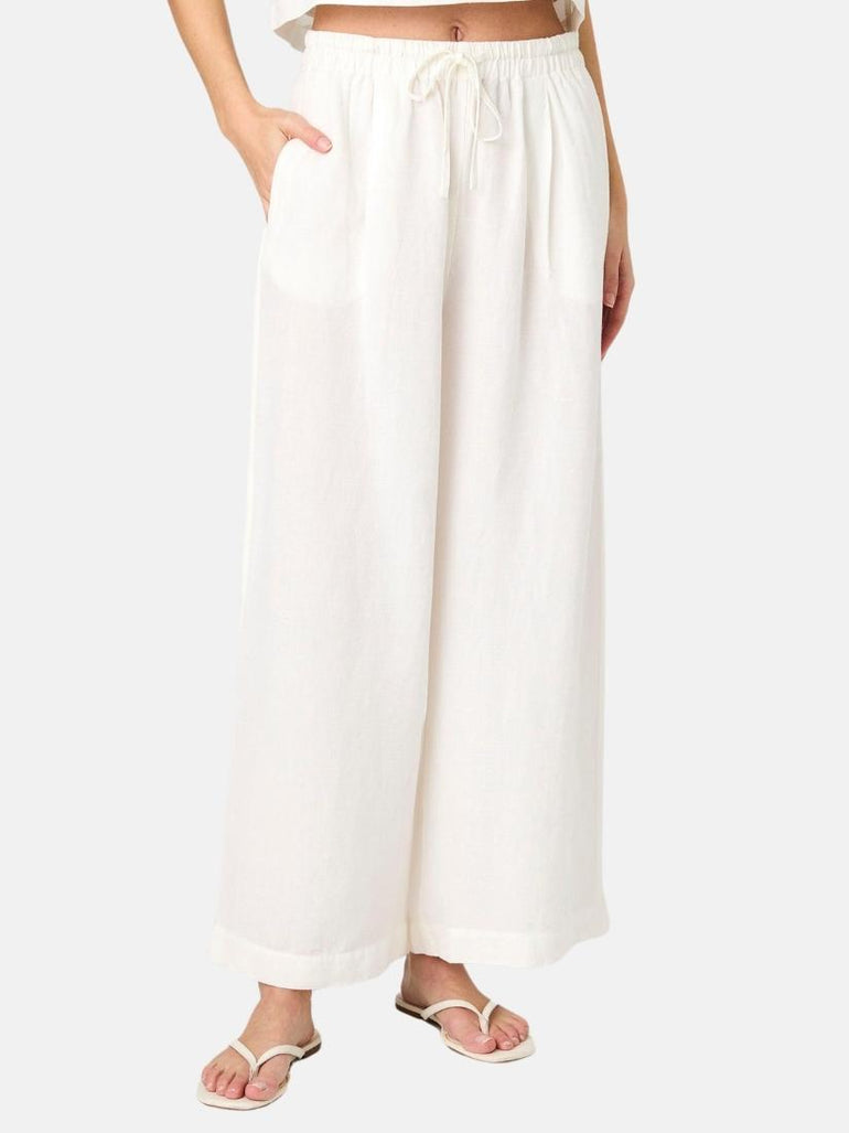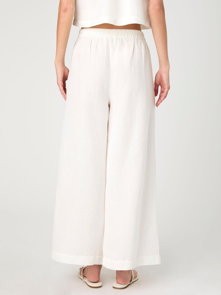 The Birdie Linen Wide Leg Trouser is a breezy, effortless piece made from a sheer, gauzy white linen that’s perfect for a laid-back, beach-ready look. Designed with an elastic waistband and drawstring for a customizable fit, these pants also feature functional side pockets for convenience. Ideal as a stylish beach cover-up, they’ll have you feeling light and carefree whether you're poolside or playa-bound.