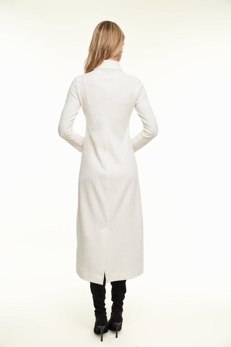 The Cable Knit Turtleneck Dress is essentially the same cozy turtleneck sweater, extended into a chic 50" long dress for a polished, full-length look. Crafted from a blend of cotton, polyester, and spandex, it offers both comfort and style. The subtle back slit adds ease of movement, making it ideal for layering or wearing on its own. Available in classic shades of Black, Mauve, and Ivory, this dress is a perfect wardrobe staple.