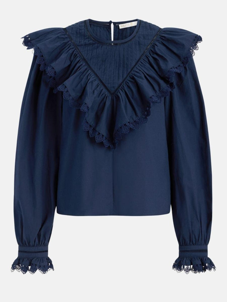 With a pleated yoke, V-shaped ruffle, and embroidered edging, Carissa brings statement-making detail to classic navy. Style it tucked into our quilted Sandra skirt for a bold look, or pair with denim to keep it polished but relaxed.