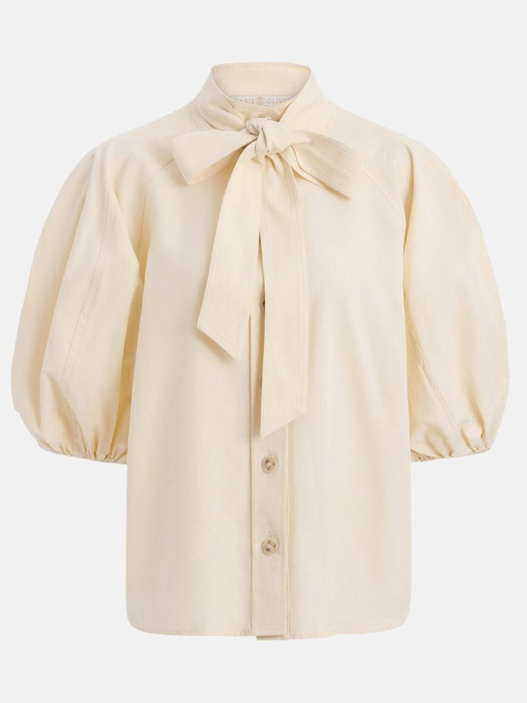 Paired with your favorite blue jeans, our new creamy Navi top adds a touch of femininity to a classic off-duty look. This stunning top features dramatically puffed sleeves, an optional tie at the neck, delicate stitch detailing, and a pretty button-front placket.