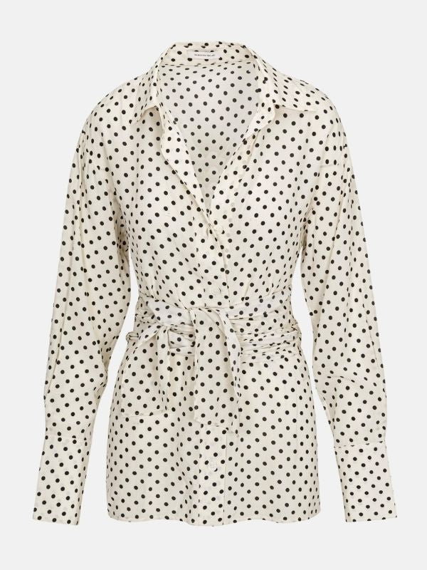Featuring a classic polka dot pattern and a flattering wrap design, this shirt combines elegance with a playful touch. The luxurious silk fabric and tailored fit make it perfect for both professional and casual occasions.