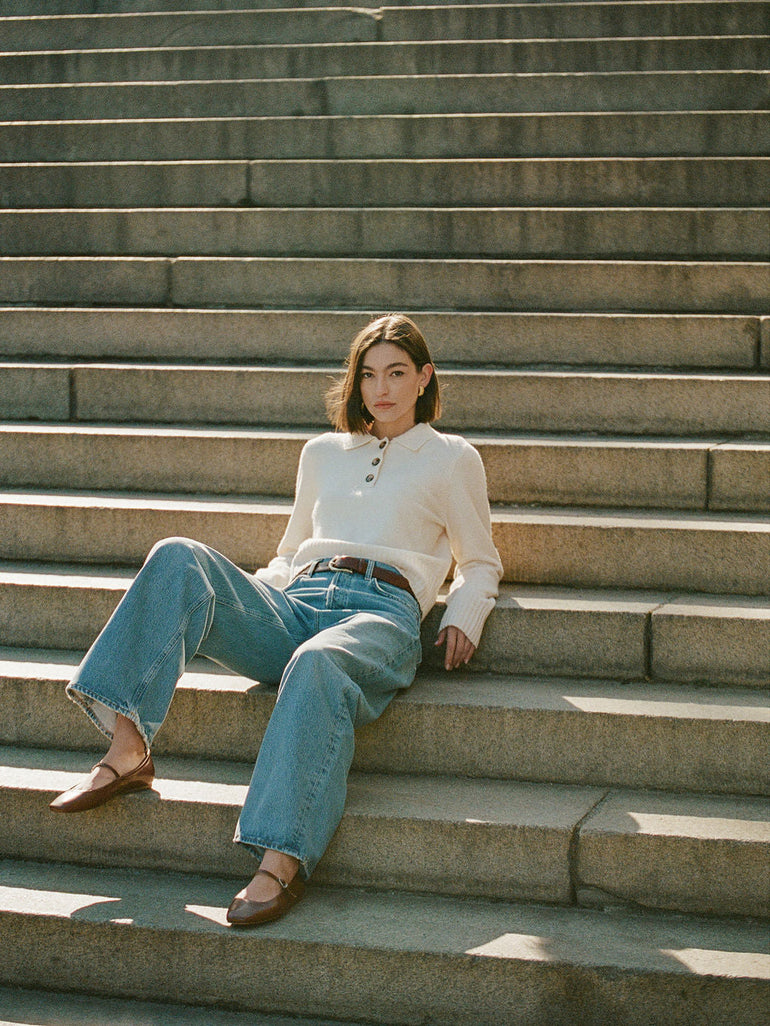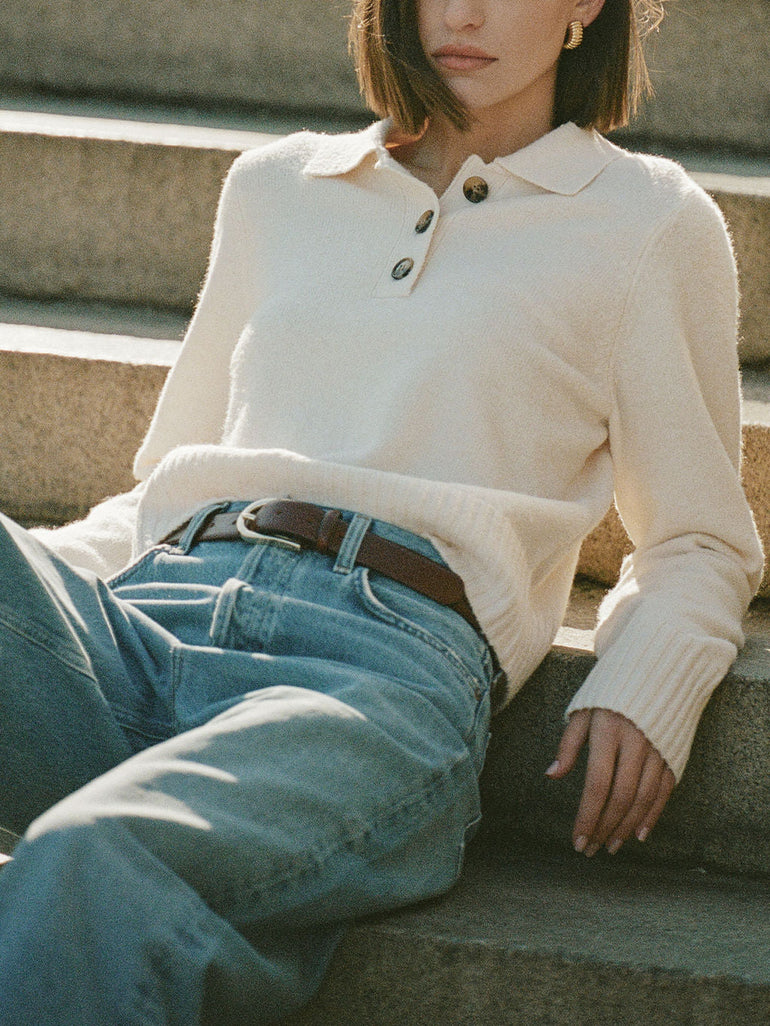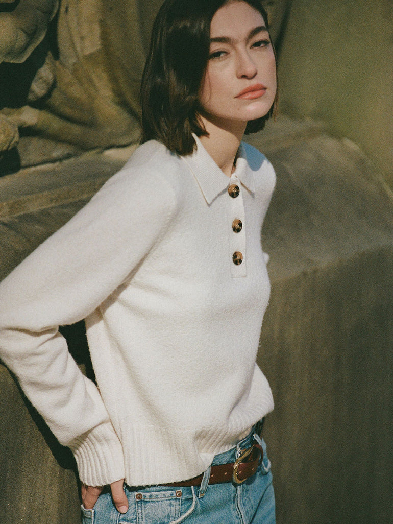 Vhari Long Sleeve Button-Front Polo Sweater in White