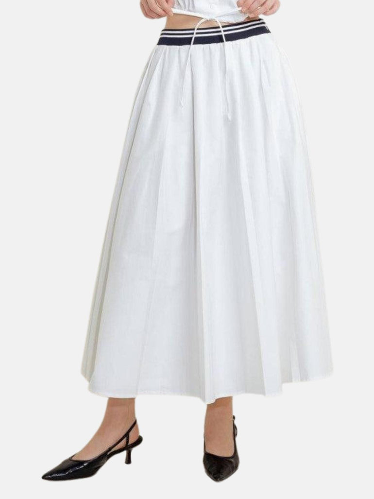 Clean lines and everyday elegance come together in this Woven Cotton Midi Skirt – a versatile staple for any season. Crafted from 100% breathable cotton, this solid-colored midi skirt features a contrasting waistband that adds a modern, tailored touch. The flattering A-line silhouette is finished with a hidden side zipper for a seamless fit. With a 36” length that hits mid-calf, it’s perfect for pairing with swim tops, tucked blouses, or lightweight knits.