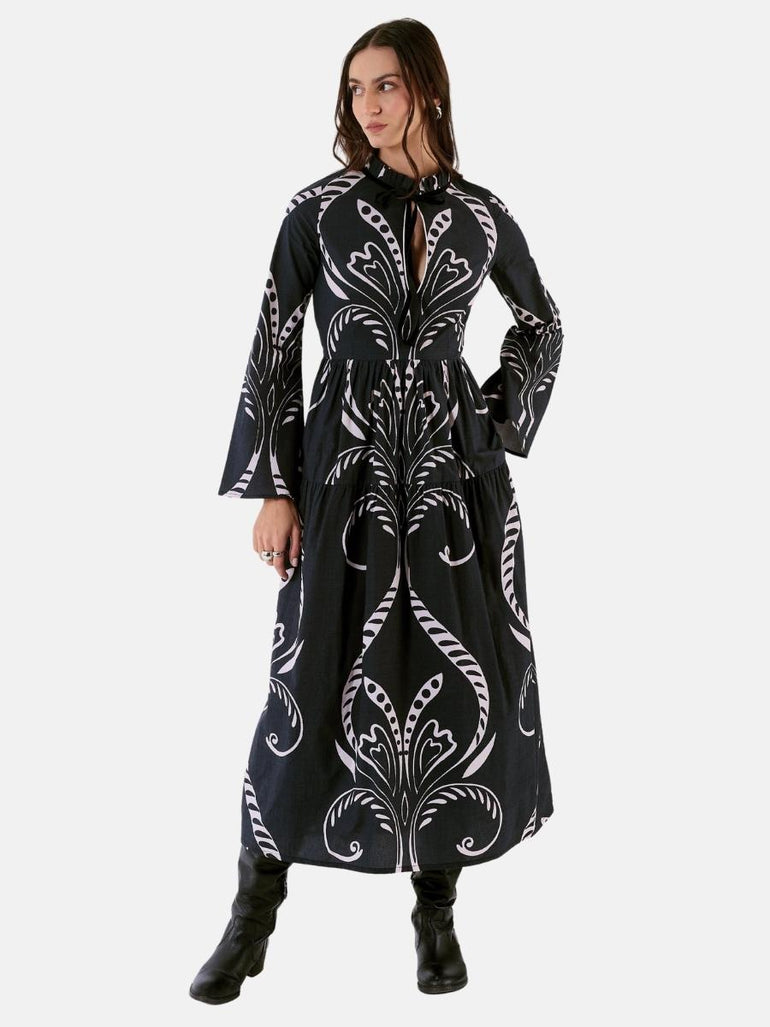 The River dress blends modern romance with timeless charm. Featuring a delicate neck opening with self-tie ribbons, it adds a subtle, feminine touch. Long bell sleeves complement the tiered A-line maxi silhouette that moves beautifully with every step. Effortlessly elegant yet relaxed, the River dress is perfect for embracing both the everyday and the extraordinary. River is crafted from crisp cotton poplin, breathable and soft against the skin. ‘Fountain’ is a print artwork that draws from the pure, revitalizing waters of a serene river, capturing that sense of renewal and tranquility.