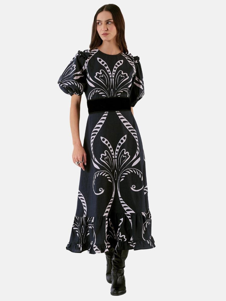 The Antonia is a wonderful choice for special occasions and everyday agendas alike. Cut with puffed sleeves, elastic cuffs and adorned with subtle frills, the Antonia falls to a slender A-line creating a flattering silhouette. Accentuate the waist with the featured belt. Antonia is crafted from crisp cotton poplin, breathable and soft against the skin. ‘Fountain’ is a print artwork that draws from the pure, revitalizing waters of a serene river, capturing that sense of renewal and tranquility.