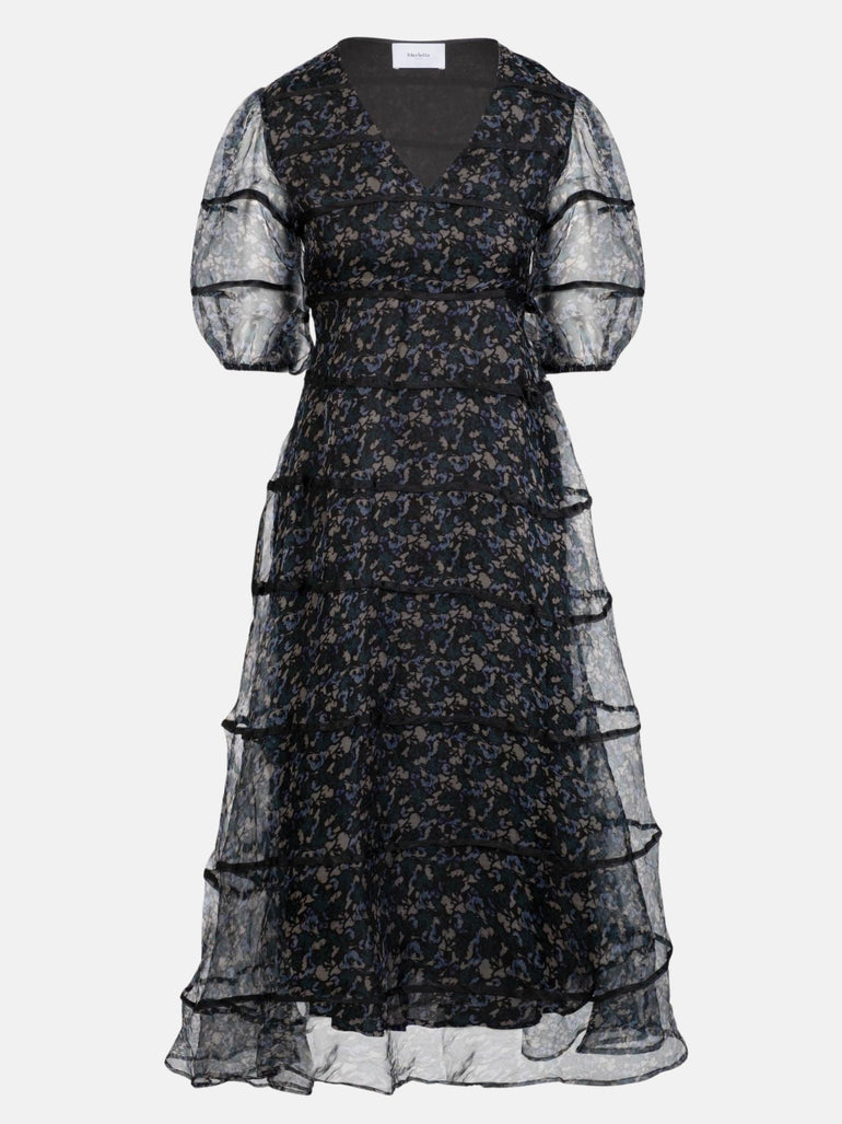 The ASTRA Dress encapsulates artistry and sophistication with its painterly floral design in a color palette inspired by the works of Japanese ceramicist Toshiko Takaezu. Crafted from ethereal 100% Silk Organza, this ankle-length dress features Merlette’s signature tiered structure, accentuated by trim made from the same fabric that create a striking, yet harmonious silhouette. Short puff sleeves lend a playful volume, while a discreet side zipper closure ensures a seamless fit.