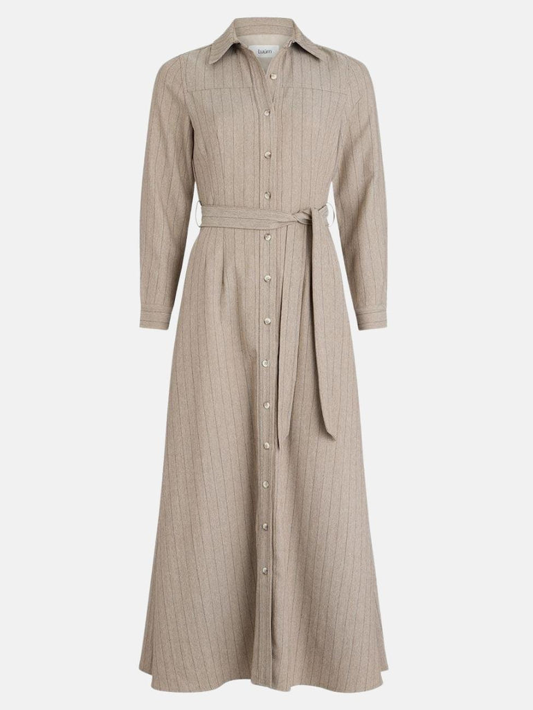 - Featuring a crisp collar and a full button-down front, it's cinched at the waist with a self-fabric tie belt, creating soft structure and a flattering, elongated shape. The tailored details and fluid lines strike a balance between ease and sophistication.