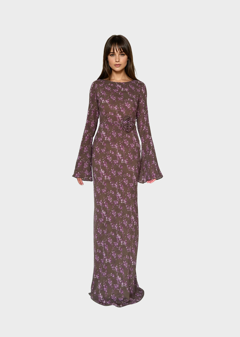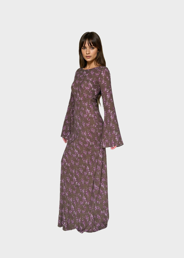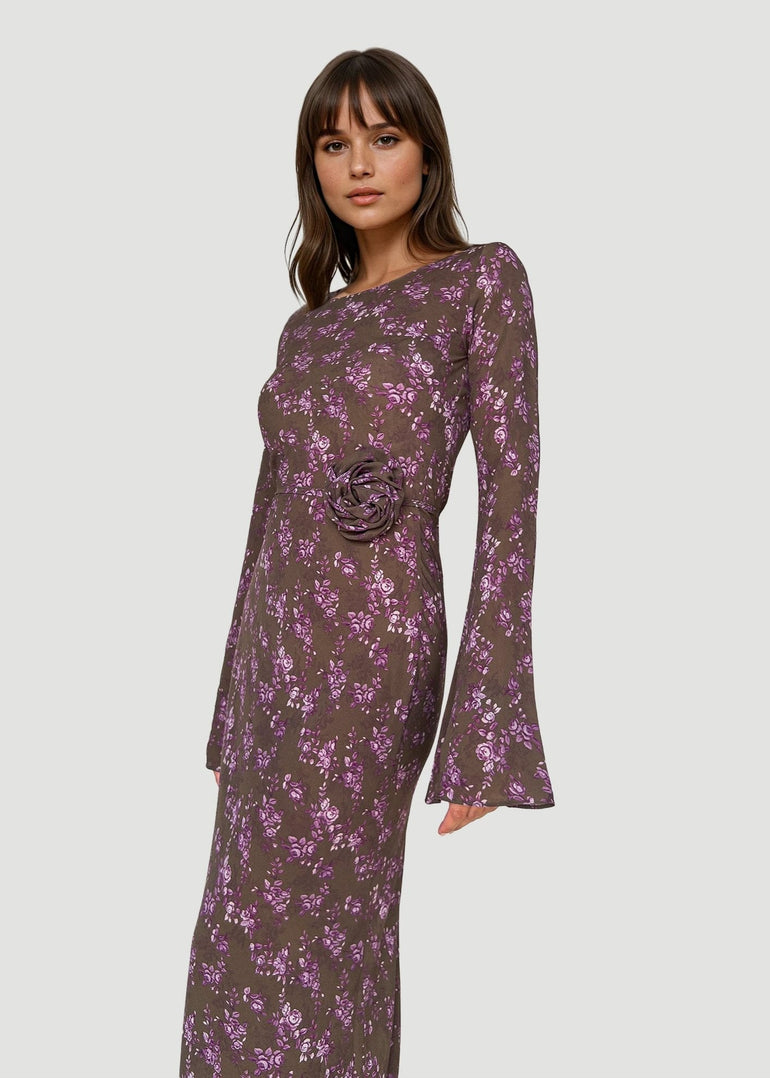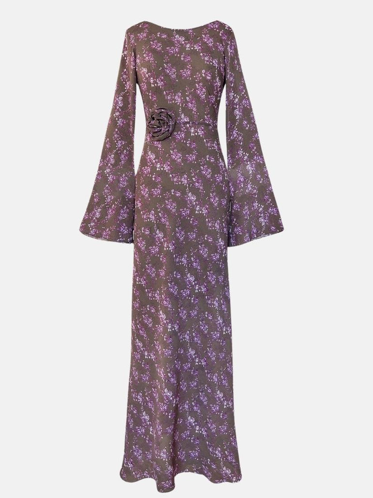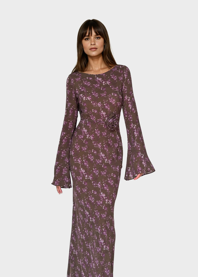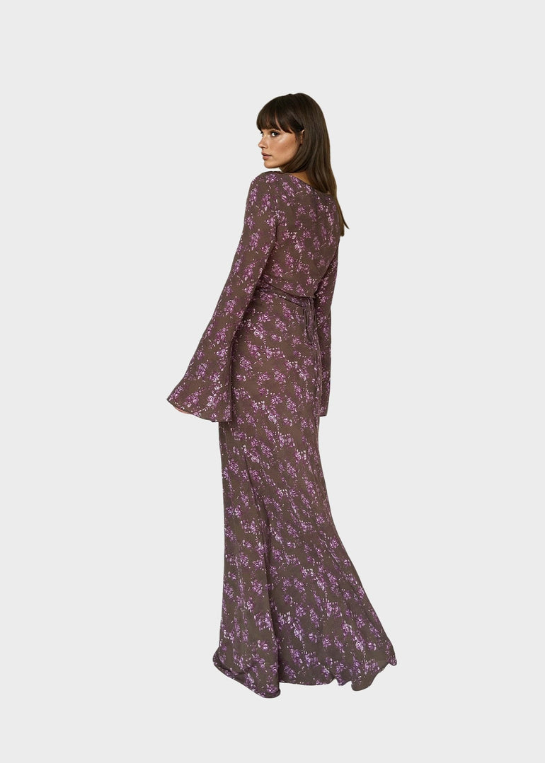 True bias cut / Maxi length / Statement bell sleeves / Slip on / Unlined / Bra friendly / Matching rosette is included