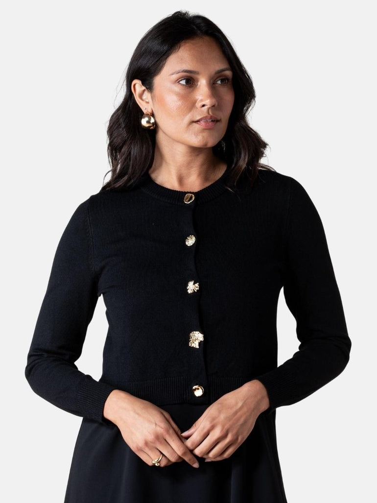 This is your classic black cardigan — but elevated. Designed with a sleek, flattering fit and finished with a row of ultra-unique gold buttons, it’s the kind of piece that quietly steals the show. Wear it buttoned up or layered open — either way, it adds polish to any outfit.