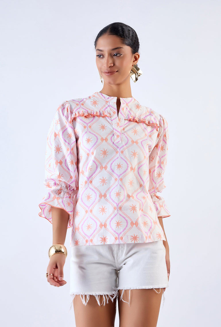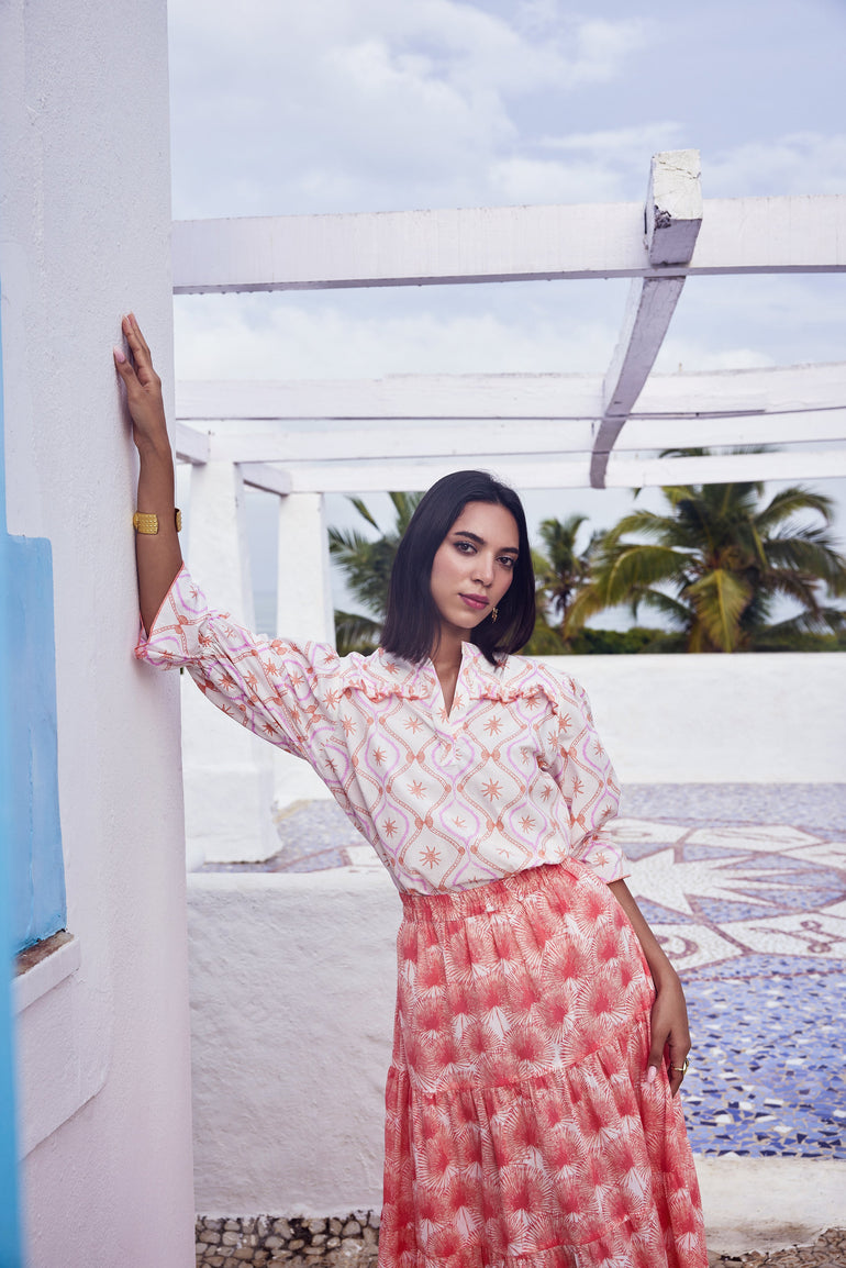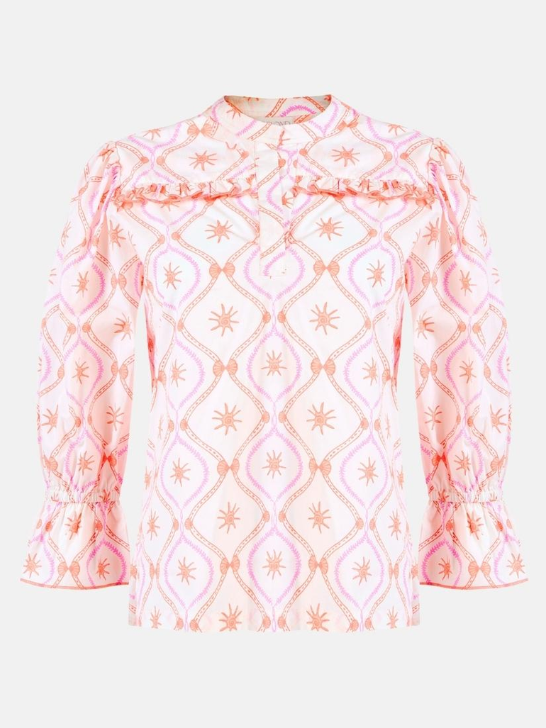 With its slightly puffed 3/4 sleeves, relaxed cut and delicate ruffle details, the Stella is a winner all year round. Pair it with our Gia Midi skirt or with Denim for a casual look. Stella is crafted from breathable premium Cotton Poplin. The print design ‘Treasures’ draws inspiration from handmade pearl and shell bracelets, symbolizing cherished souvenirs that whisk you back to those sun-kissed moments by the shore.