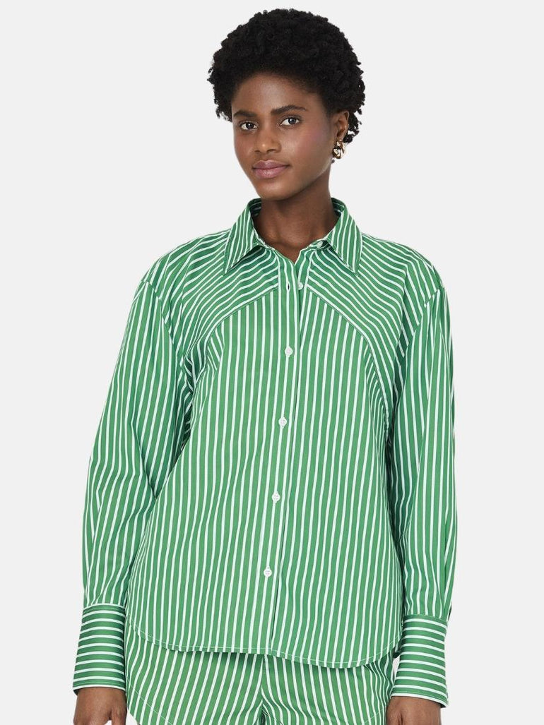 Get your spring wardrobe in line with our Alexis Cotton Angled Yoke Striped Shirt! This isn't your average striped shirt - it features thoughtful angling along the front seams as well as diagonal back pleating which is sure to turn heads. Dress it up or down with your favorite trousers, or opt for an easy set with our matching shorts.