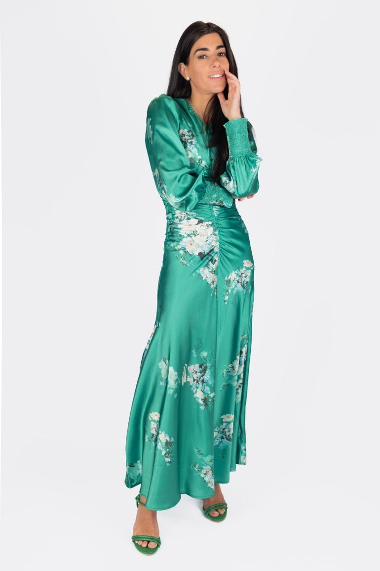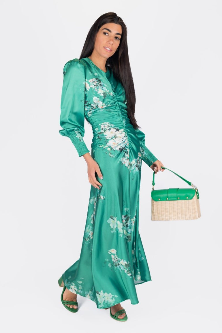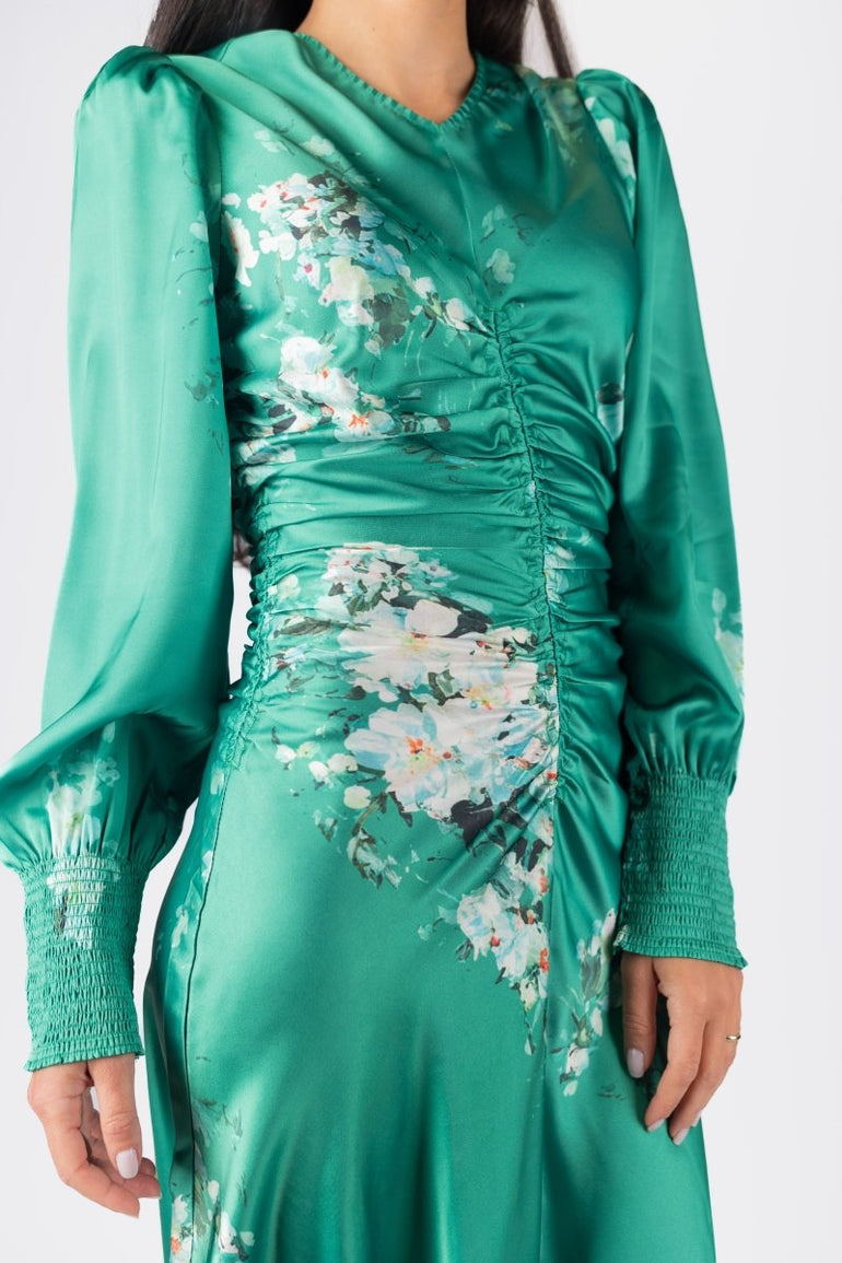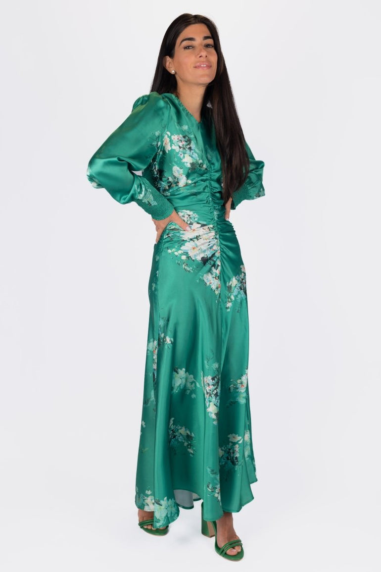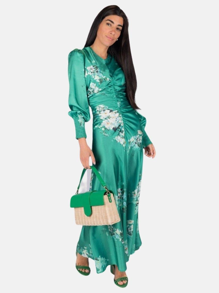Turn heads in this stunning emerald satin maxi dress, designed with a romantic floral print and flattering ruched detailing down the front. Featuring elegant puff sleeves with smocked cuffs and a flowing silhouette, it moves beautifully with every step. Perfect for spring/summer events, garden parties, or any special occasion where you want to make a graceful statement.