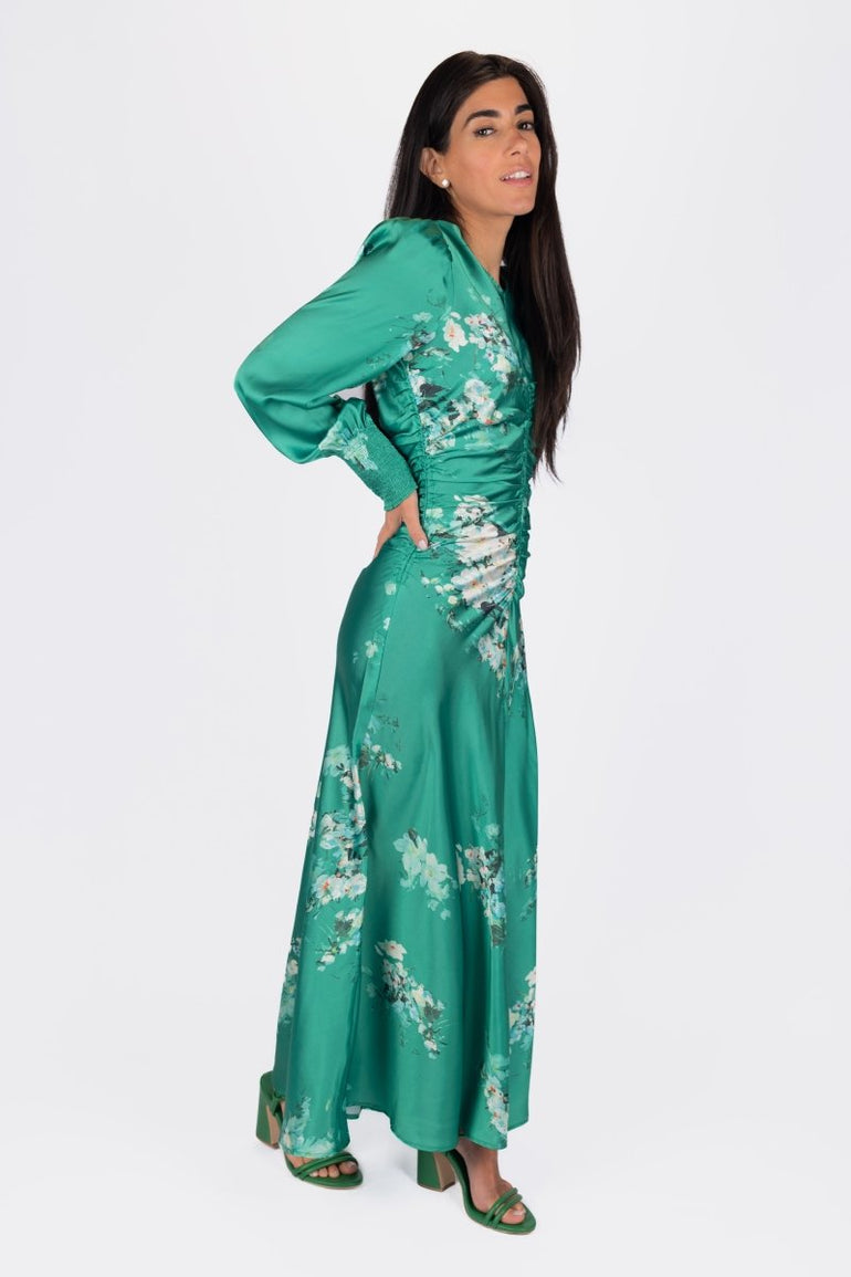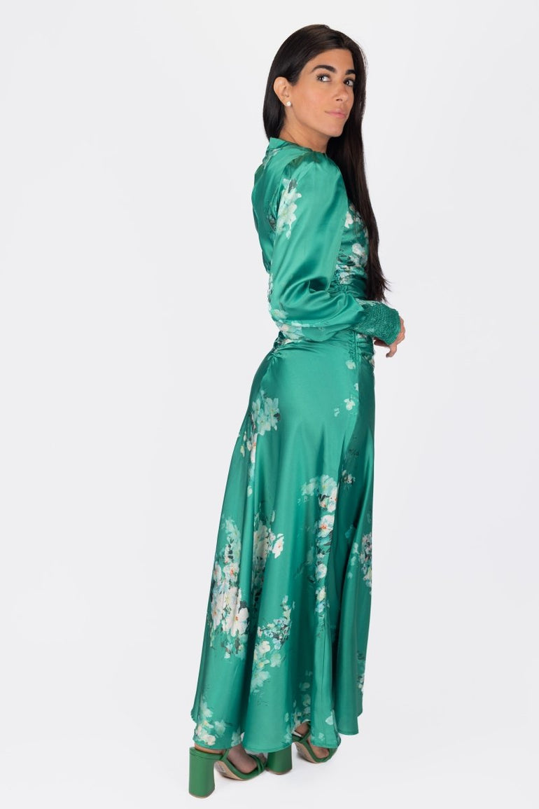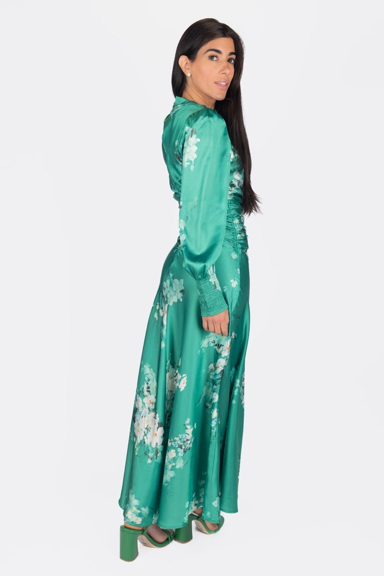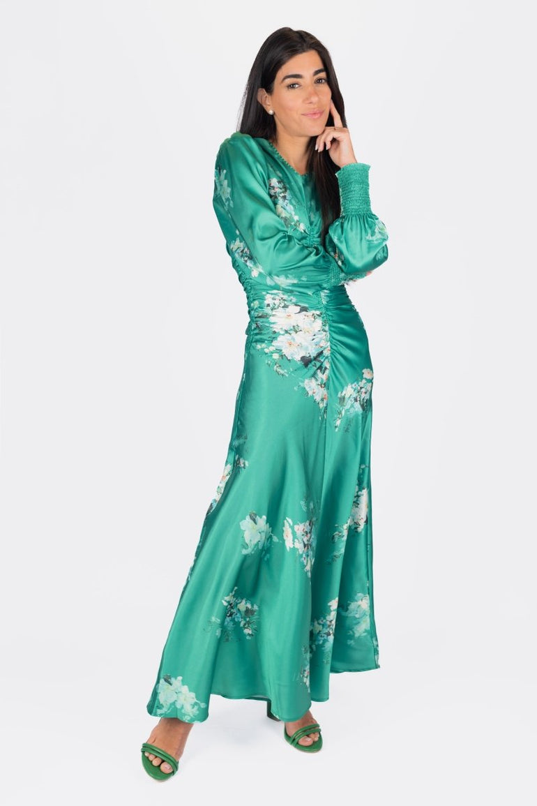 Turn heads in this stunning emerald satin maxi dress, designed with a romantic floral print and flattering ruched detailing down the front. Featuring elegant puff sleeves with smocked cuffs and a flowing silhouette, it moves beautifully with every step. Perfect for spring/summer events, garden parties, or any special occasion where you want to make a graceful statement.
