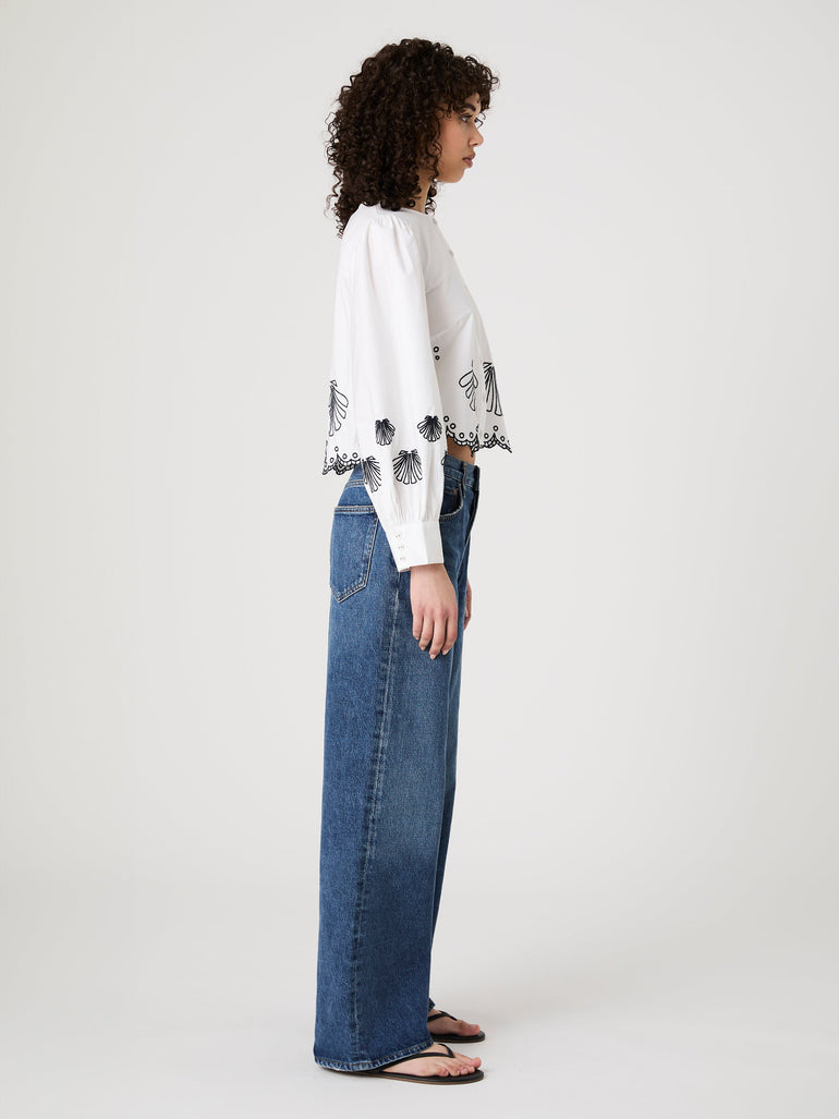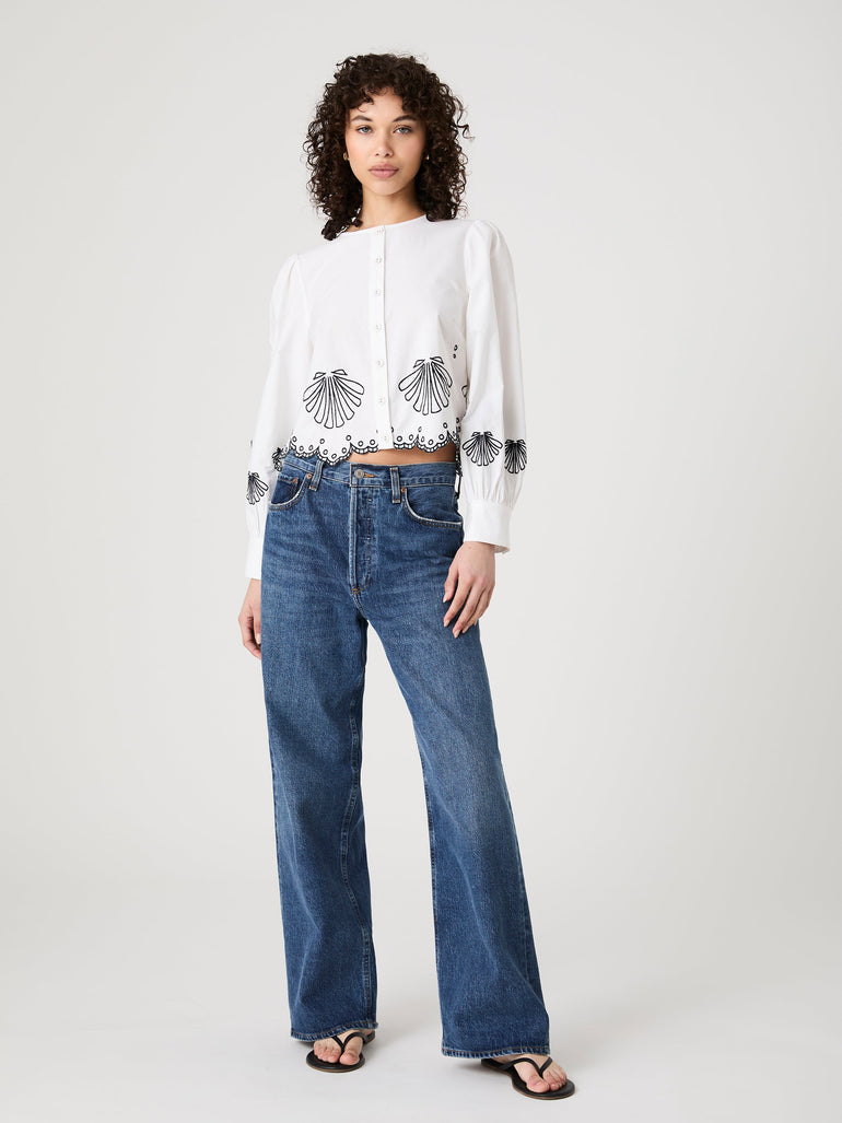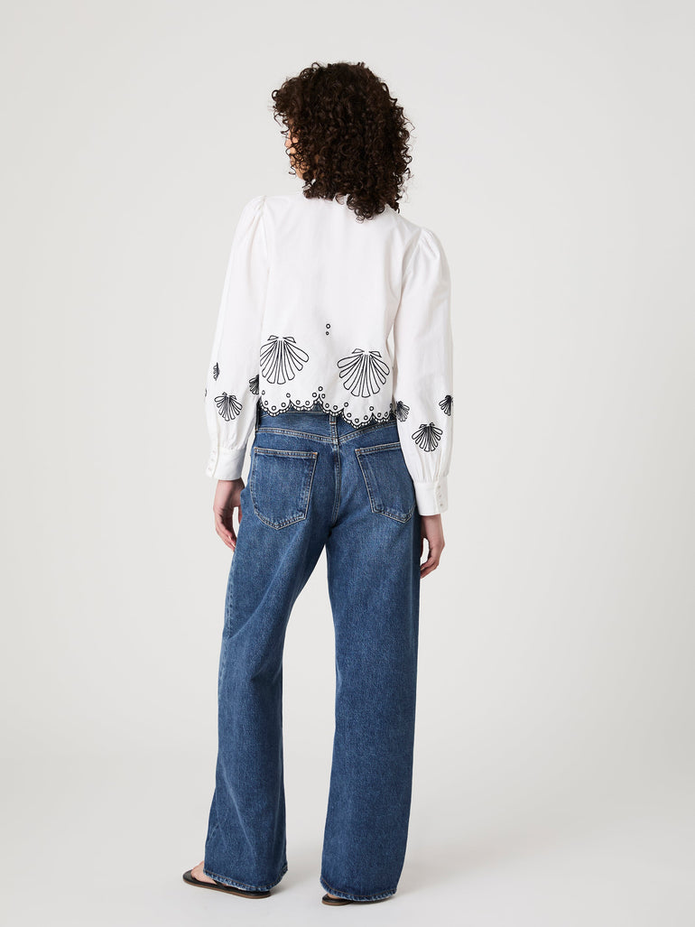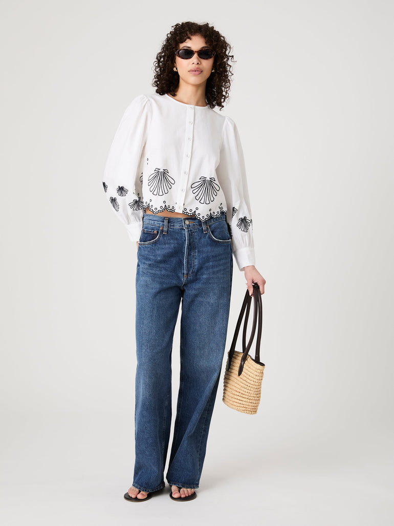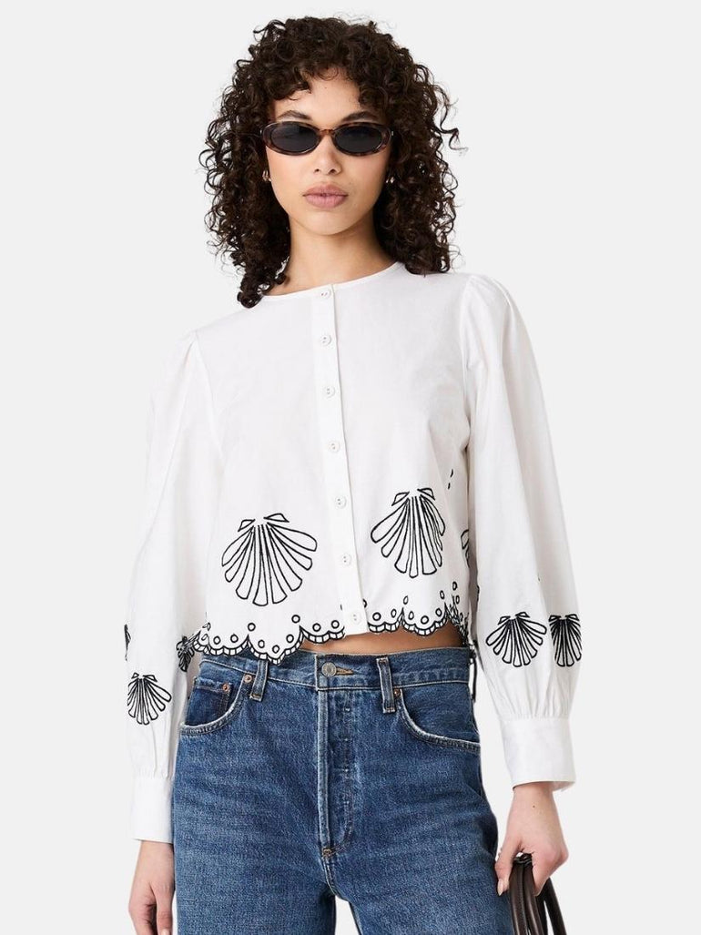 A playful touch of bohemian meets nautical charm to your wardrobe with our Cambria Cotton Embroidered Long Sleeve Shirt. This white button down shirt features a round neckline, seashell embroidery and a scalloped hem.