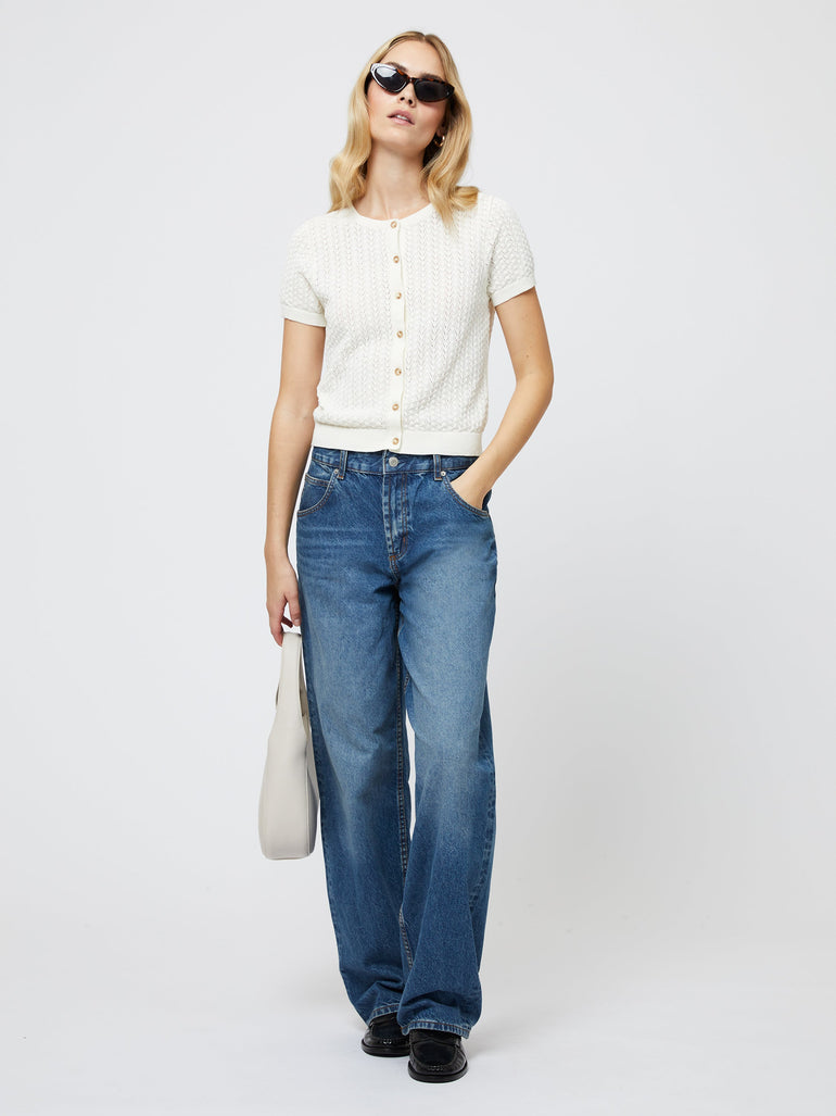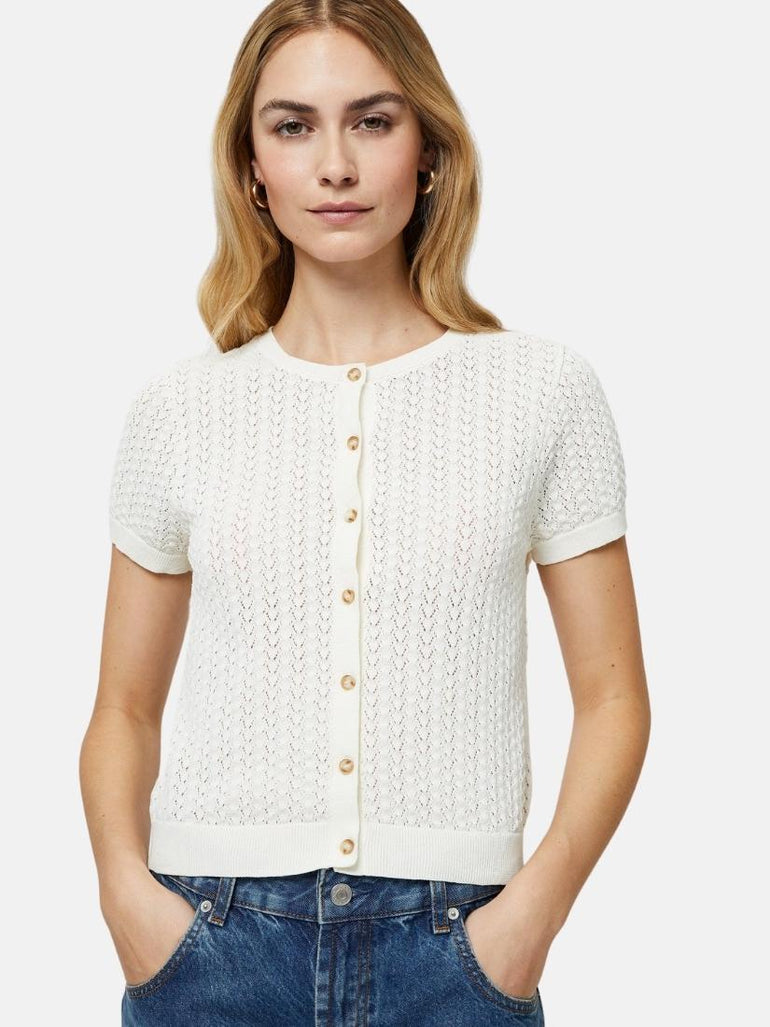 Introducing our Cotton Blend Pointelle Cardigan, the perfect addition to your spring wardrobe. This short sleeve cardigan fits like your favorite baby tee, and features all over pointelle for a delicate look. Made with a cotton blend, it's lightweight and comfortable for all-day wear. Elevate any outfit with this elegant piece.