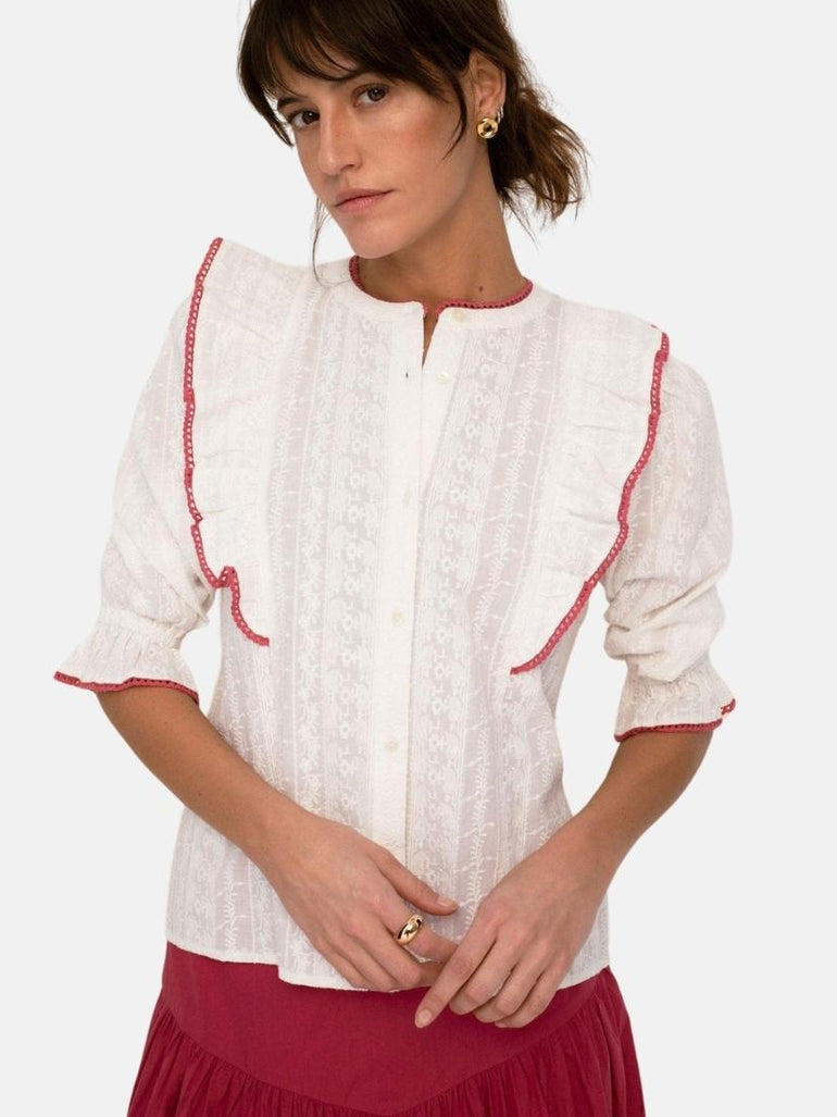 In the softest organic poplin cotton, your loved Jo blouse is back with new embroidereis. It features round collar and short puffed sleeves finished with delicate lace trims
