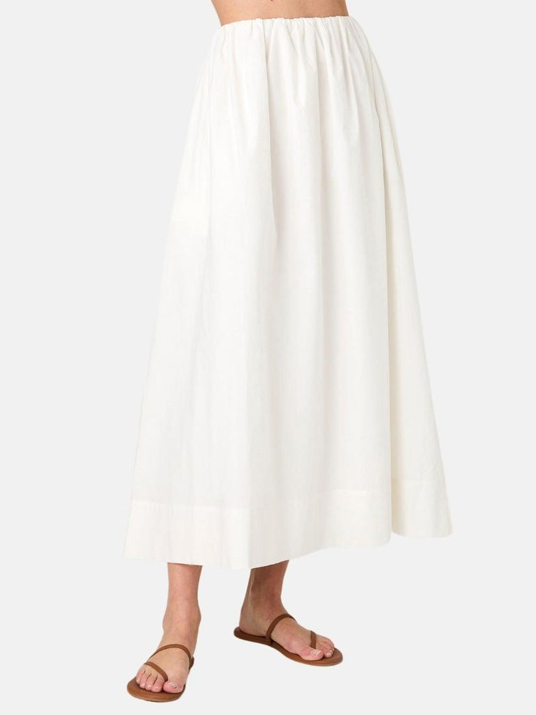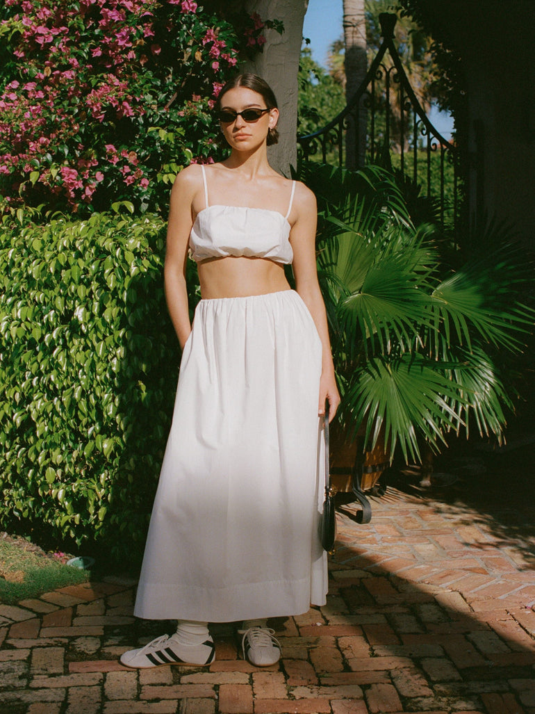 Easy, breezy, and ready for anything. The Nomi Cotton Ruched Midi Skirt is crafted from crisp white cotton poplin, featuring a voluminous ruched elastic waistband and functional side pockets (because we love options). It pairs perfectly with the Nomi Cotton Crop Top or the Poplin Strappy Peplum Top for a monochrome moment, or throw on a light sweater when the temps start to dip.