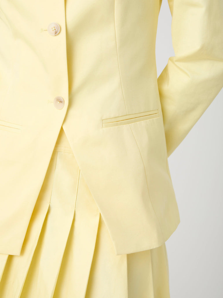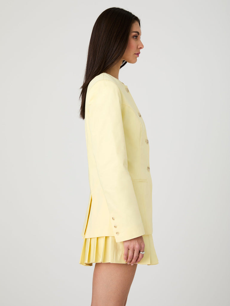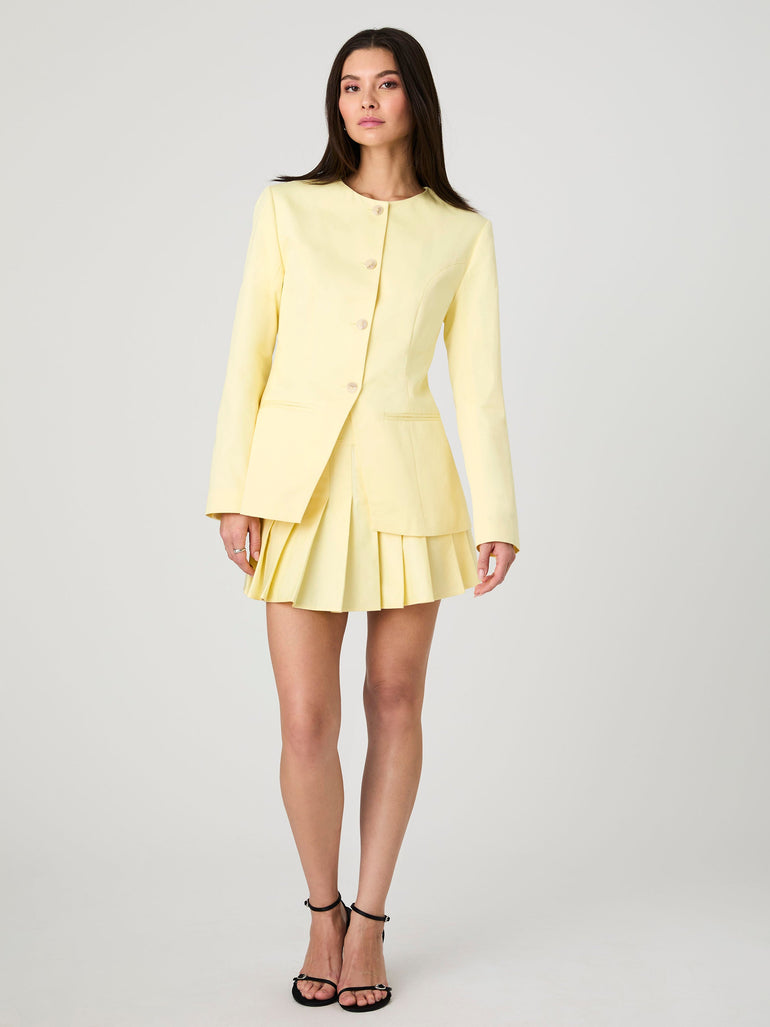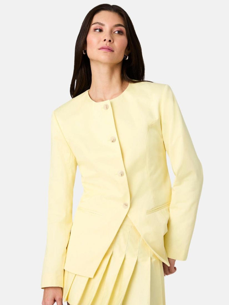 Suit yourself. The Sabine Twill Slim Fit Jacket is where sleek tailoring meets modern style. Made from structured cotton twill suiting fabric, this jacket features a round neckline, button-front closure, and a figure-flattering split hem. Thoughtful details like double welt pockets at the waist, a tailored back tab with button accents, and a double vent add an elevated touch. Pair it with the matching Sabine Twill Pleated Mini Skirt for a polished set, or style it with chic denim for a more casual vibe. This jacket brings the perfect balance of structure and versatility to your wardrobe.