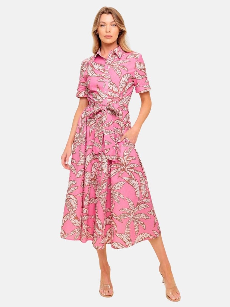A printed woven midi dress featuring collar, short cuffed sleeve, front button down, self sash tie and full skirt.
