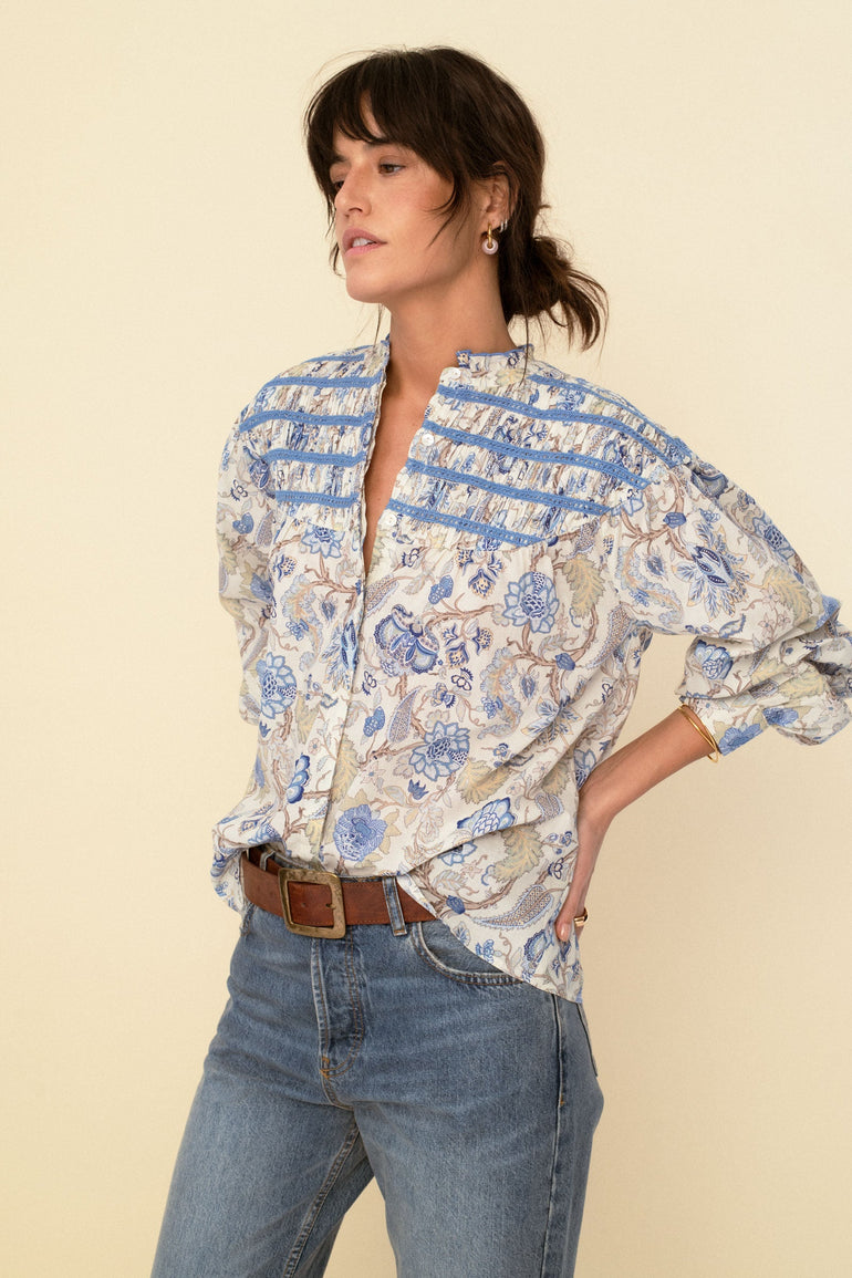 Crafted from a lightweight cotton voile, theis vintage-inspired shirt features delicate cotton laces throughout the yoke