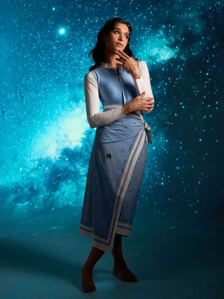 The Celestial set, features a long sleeve laser cut bathing suit with zipper in the front and built in top and bra cups for extra support. Paired back to a mid lenght pareo (sarong) that you can choose to wear tied at the side or as a skirt closed with the invisible buttons. The Pareo is made of swim proof material as well and will dry within minutes. Non see–through.