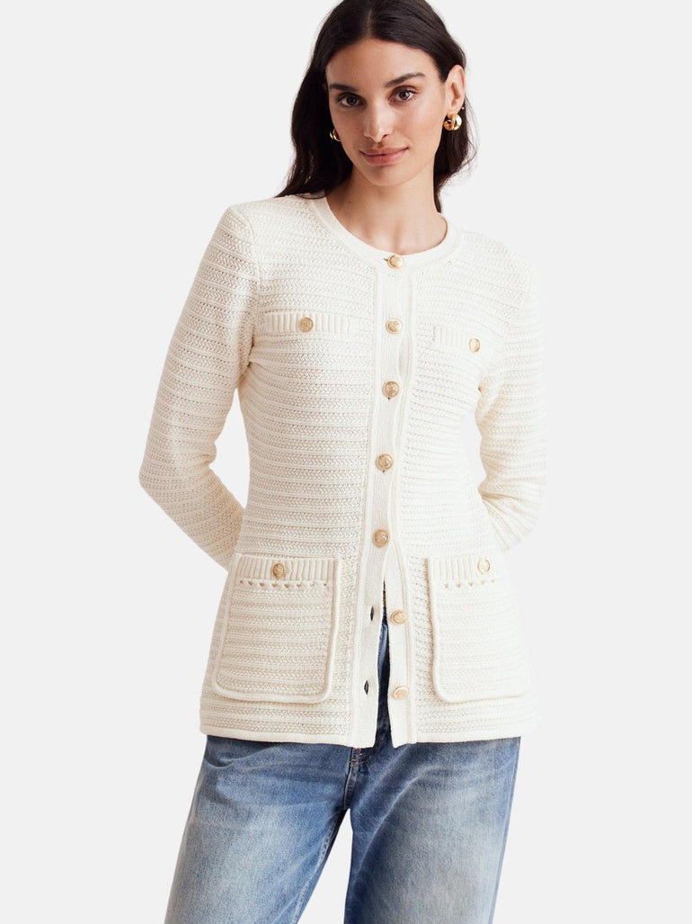Elevate your wardrobe with the Constance Jacket – a refined blend of texture, structure, and sophistication. Crafted from soft cotton knit, this timeless jacket features intricate textured stitching and luxe gold crest buttons for a polished finish.