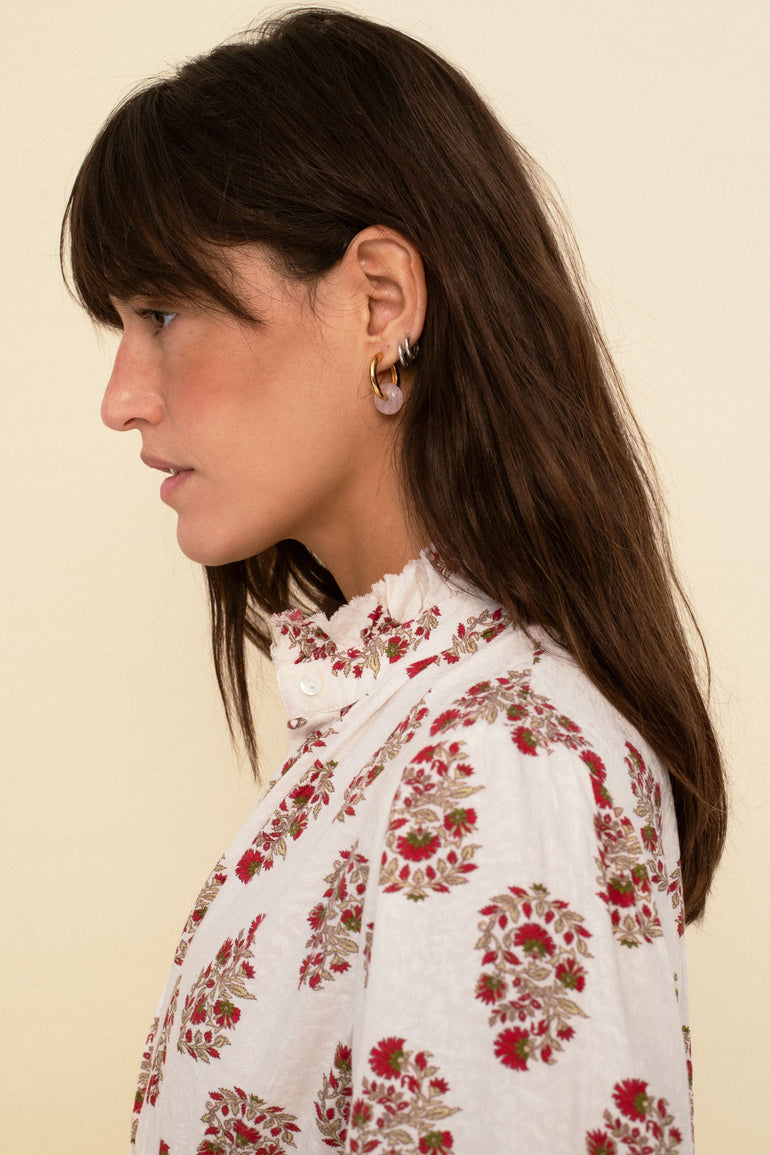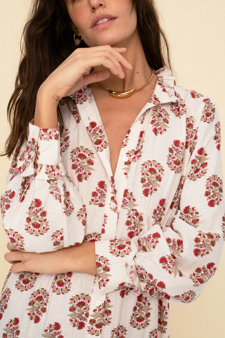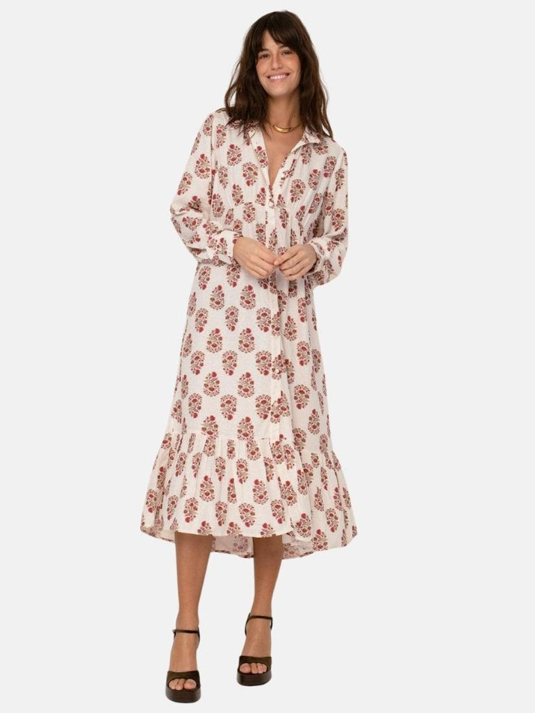 In a drapey viscose jacquard and rendered in our beautiful block print Juana dress features generous full-length sleeve and a delicate under chest cut with darts and is buttoned from top to bottom.