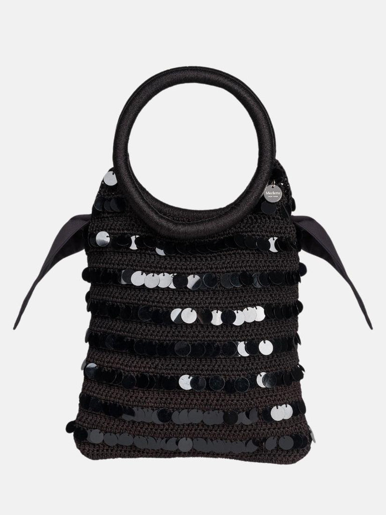 The MARIS Sequin Bag is a true statement piece. Handmade from 100% viscose cord using intricate crochet techniques, it showcases exquisite craftsmanship. Tonal sequins adorn the surface. The ruched handle offers a comfortable grip, while the pima poplin bag insert provides ample space for your essentials. Finished with a Merlette metal logo charm, this handbag seamlessly blends style and function.