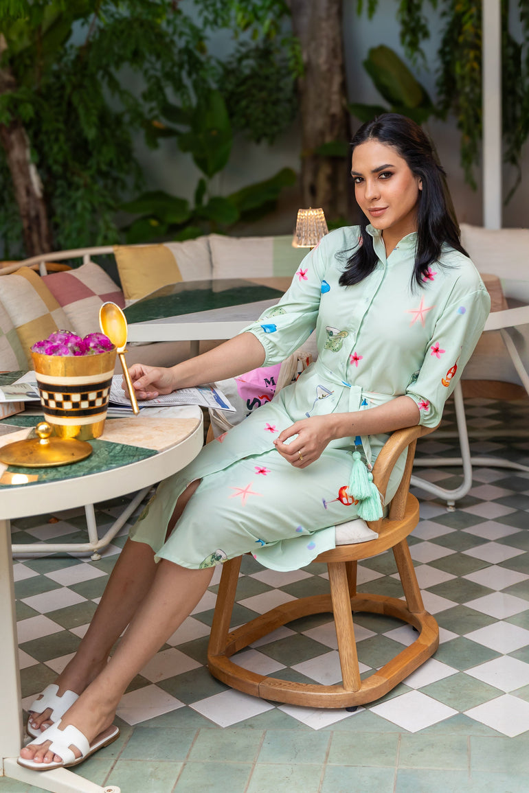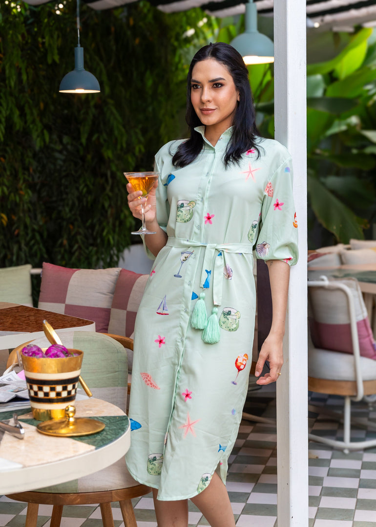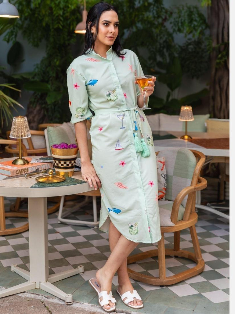 Features a lightweight waterproof fabric button down dress with a matching belt with added tassels for a chic look!